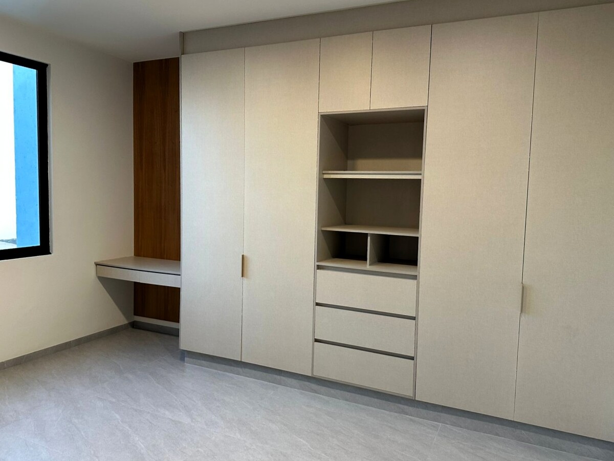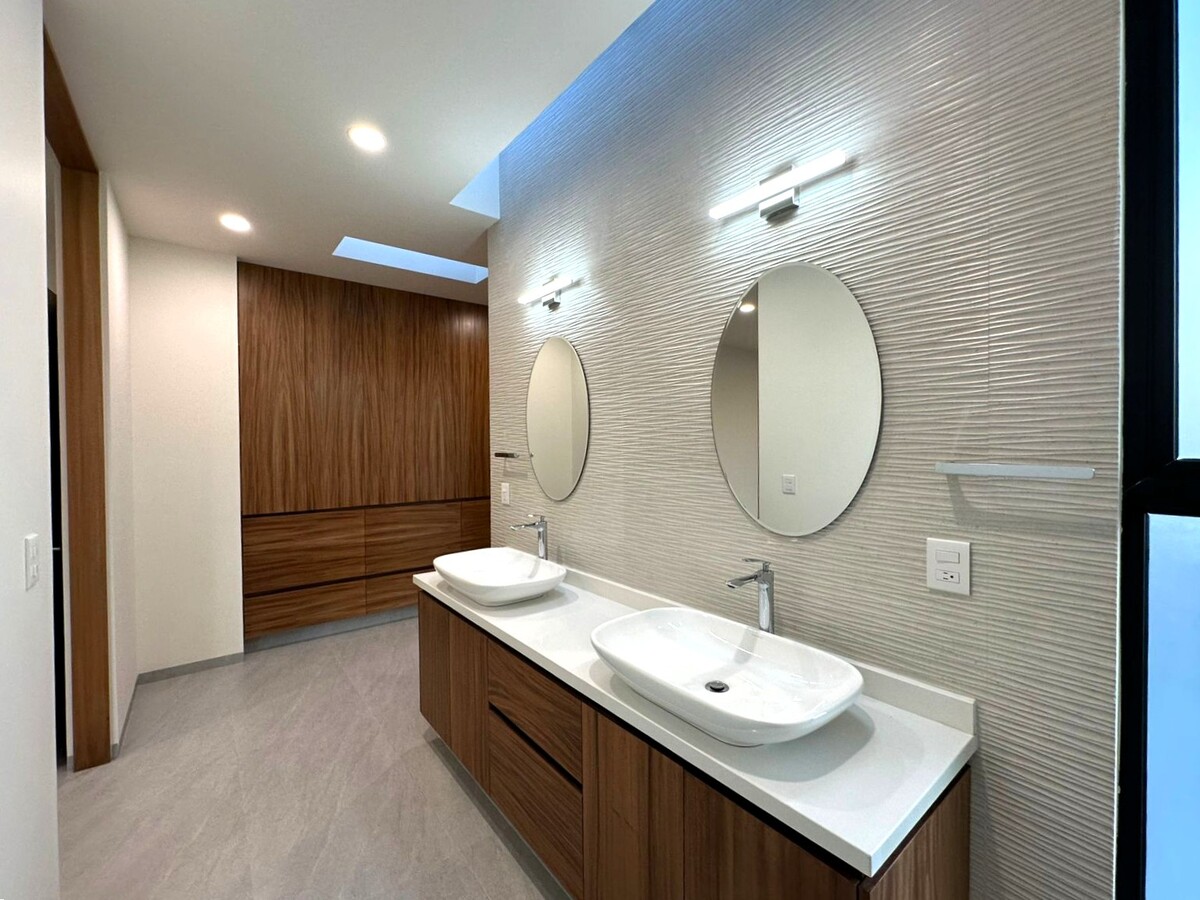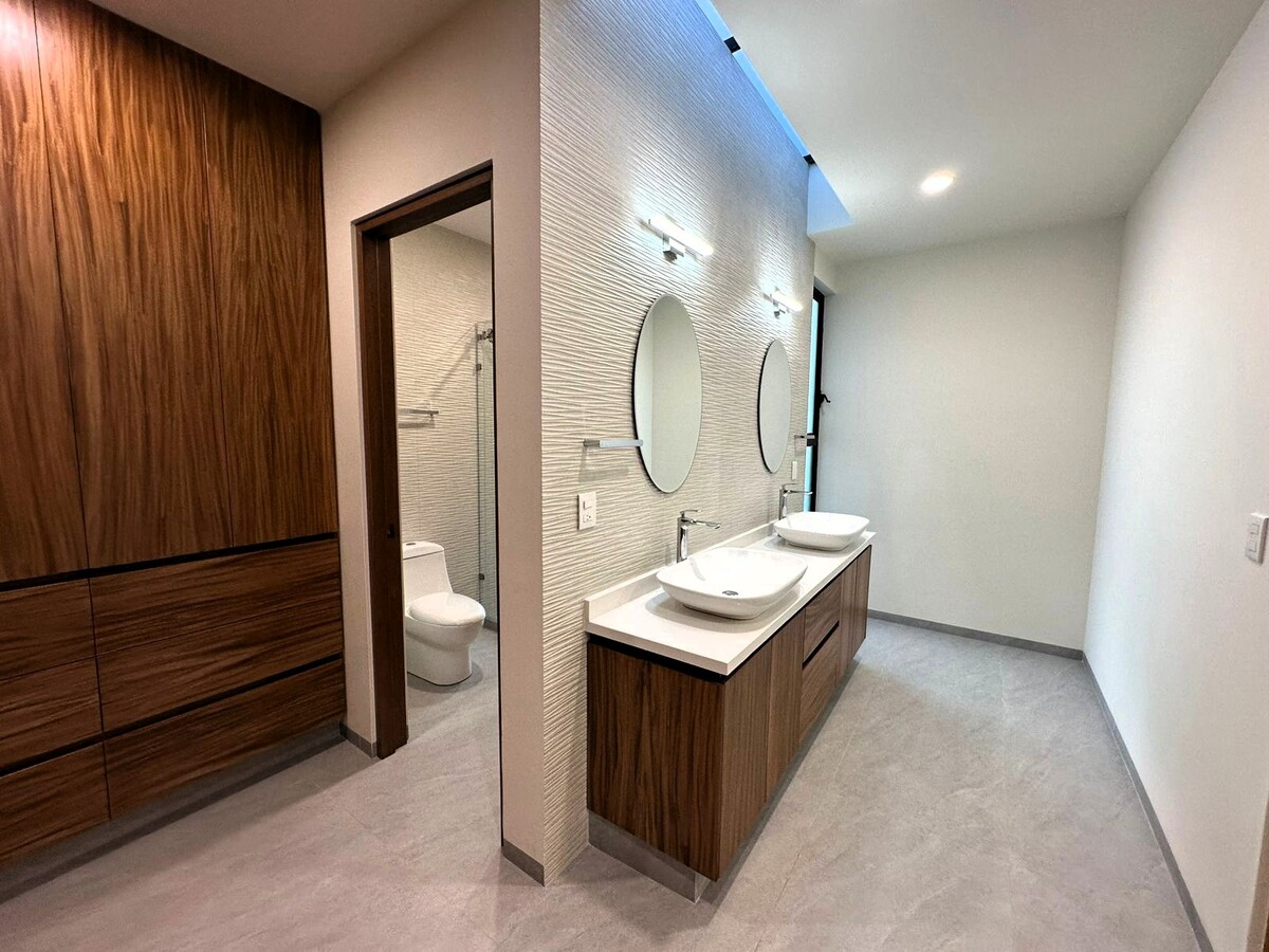 En planta alta; Área de TV o estudio, recamara principal con gran vestidor con múltiples compartimentos y espacios, baño propio con cancelería de vidrio templado y herrajes de acero inoxidable y tocador con dos lavabos. Dos recámara secundarias con amplios closets con escritorio y gran calidad de materiales y espacios.