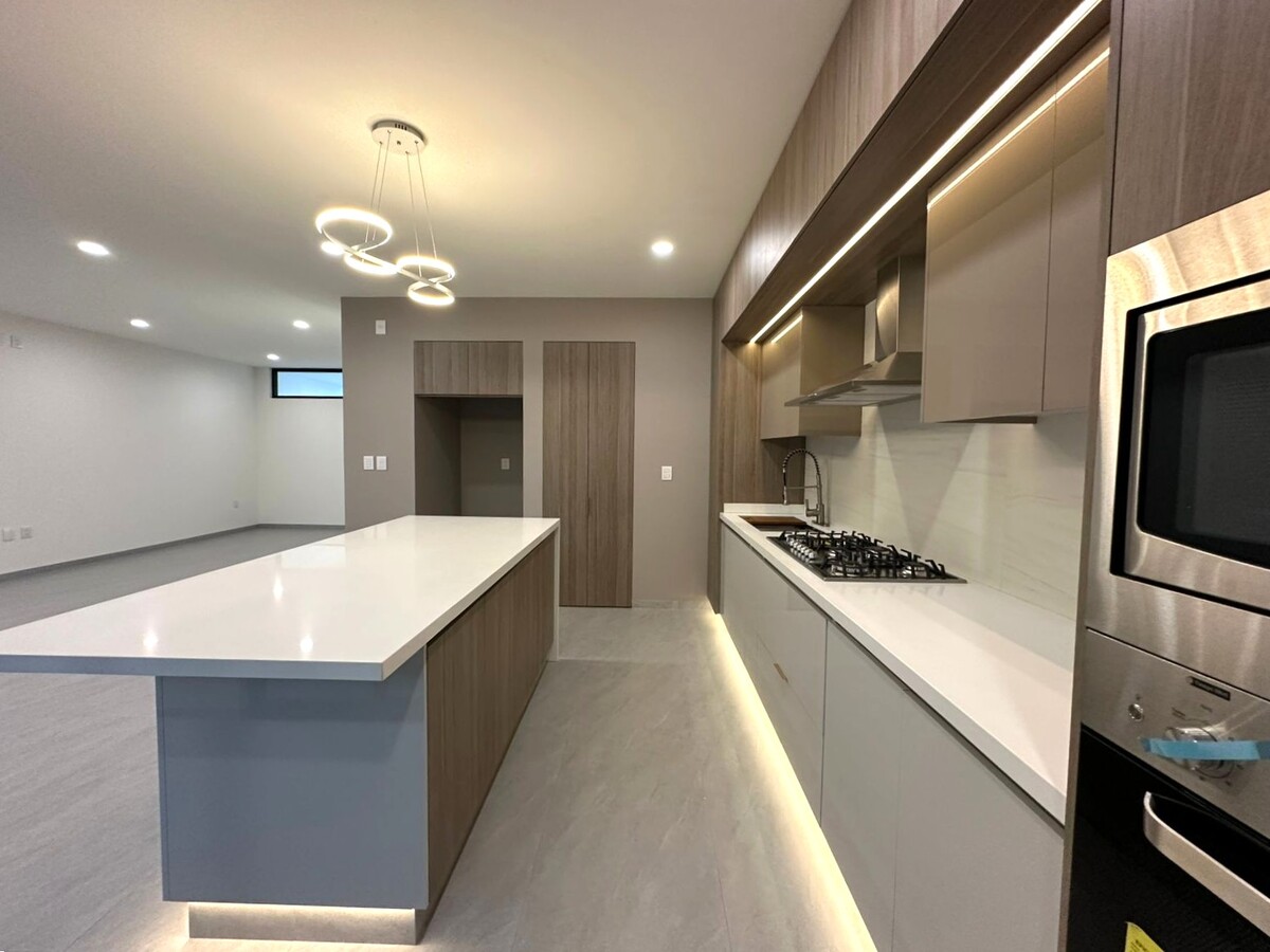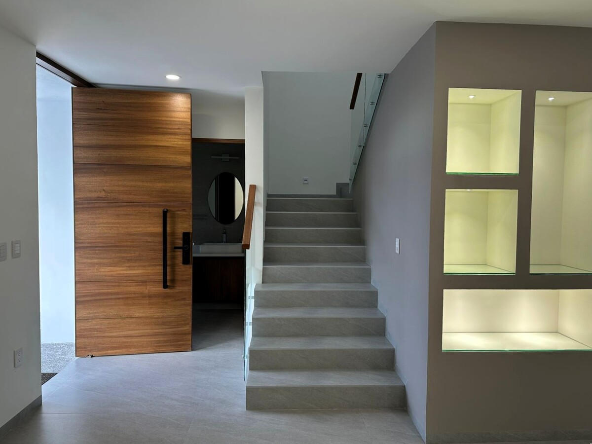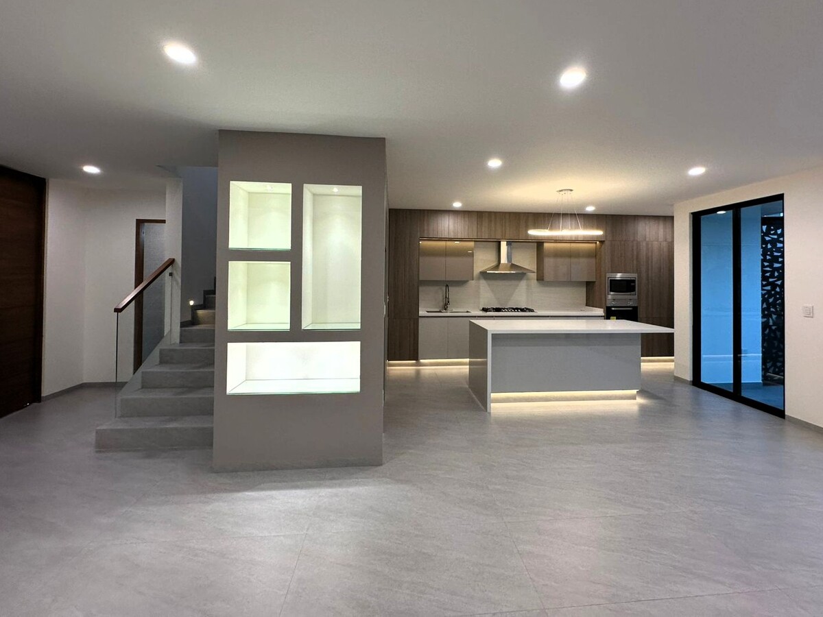 El equipamiento incluye cisterna de 5,000 l. con bomba presurizadora sumergible y sistema bypass, vidrios templados en barandales de escalera techo de área de lavado, luces indirectas decorativas y funcionales en interiores y exteriores, apagadores tipo escalera en varias de sus habitaciones, puerta principal de parota con alma de acero y mecanismo de pivote, cerradura eléctrica de combinación, puertas interiores de madera solida, muebles de baño y grifería marca Helvex e Interceramic, acabados cerámicas en muros, luminarias LED, canceles de vidrio templado en todos los baños, cubiertas de cocina de cuarzo, Herrajes Häfele de cierre lento en cocina y closets, tarja con accesorios, lámparas decorativas, ventanas con vidrio tíntex, pisos de porcelanato rectificado 60 x 120, zoclo remetido al muro, calentador de agua de paso, tanque de gas estacionario de 180 l., pasto en jardín y plantas en jardinera frontal, follaje tipo muro verde en parte alta de muros de jardín, energía 220 v. bifásica, nichos decorativos con luz led y repisa de vidrio, preparación para equipo de aire acondicionado en recámara principal, etc.