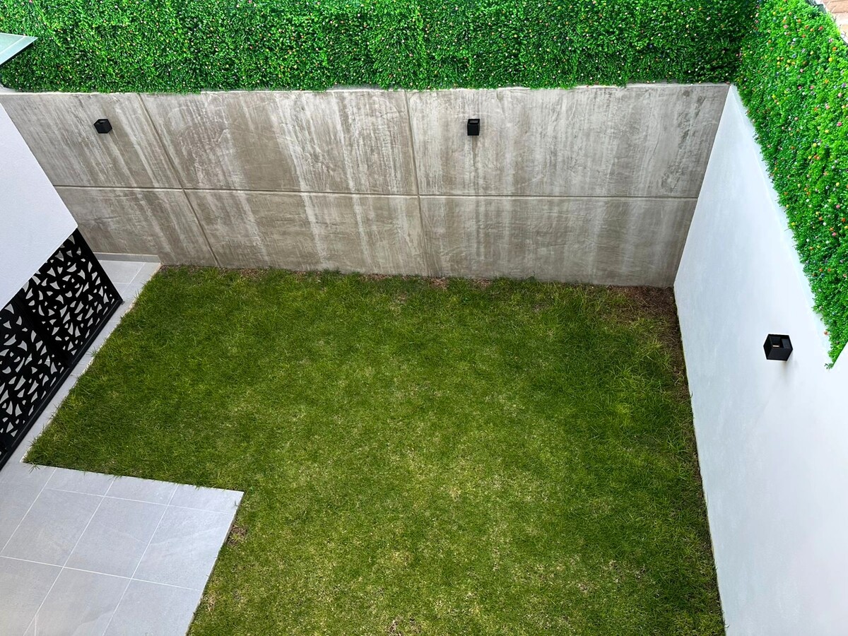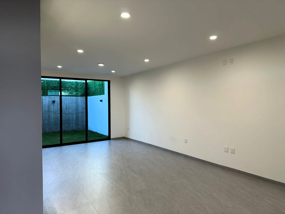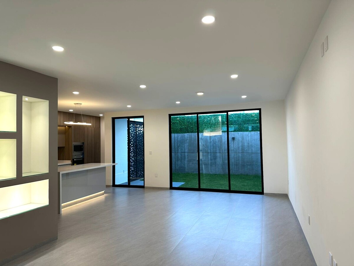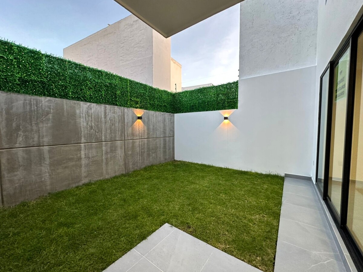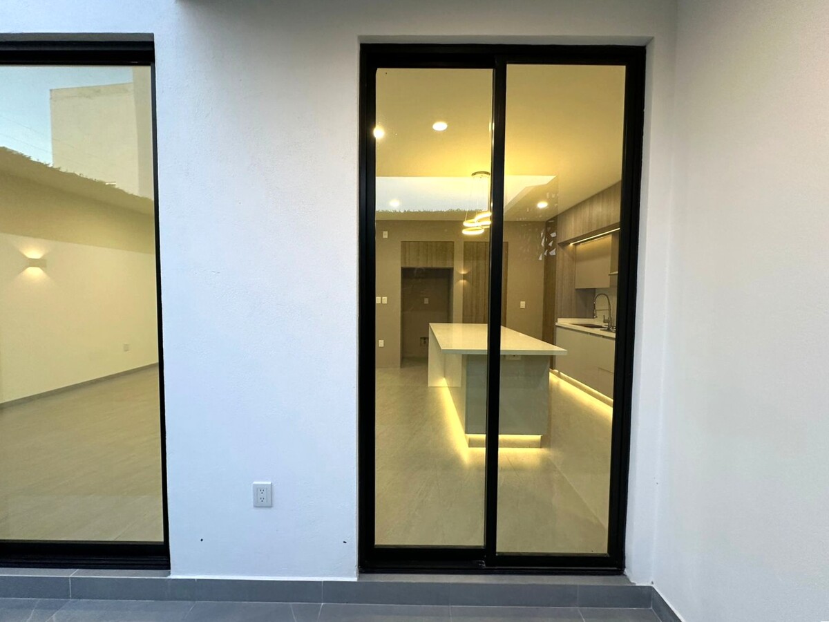 Cochera para dos autos, en planta baja medio baño de visitas, bodega, estancia abierta para sala y comedor que comunica directamente con una cocina abierta con múltiples y muy prácticos compartimientos, área de lavado techada y un bonito jardín y terraza que comunican a través de ventanal corredizo con comedor principal y cocina.