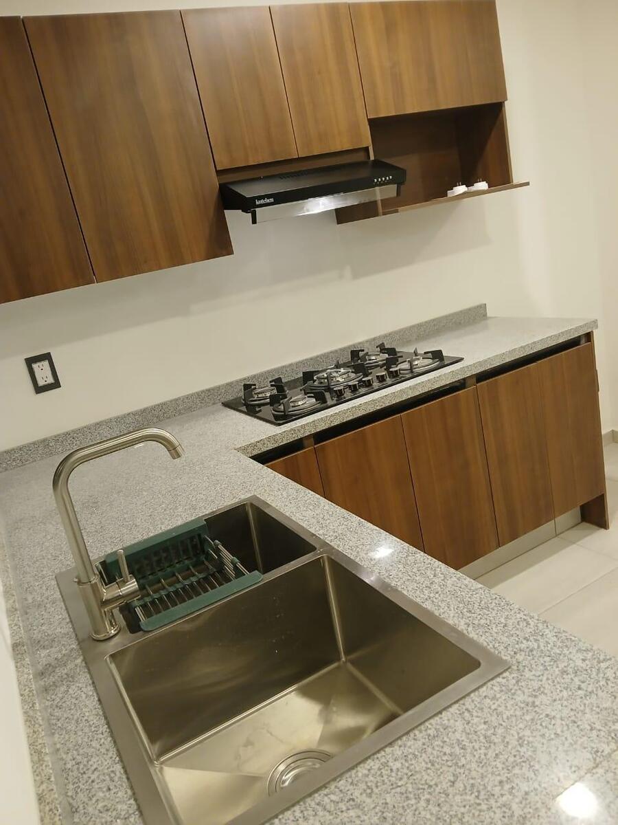 Cocina integral abierta con barra desayunadora, integrada al área social