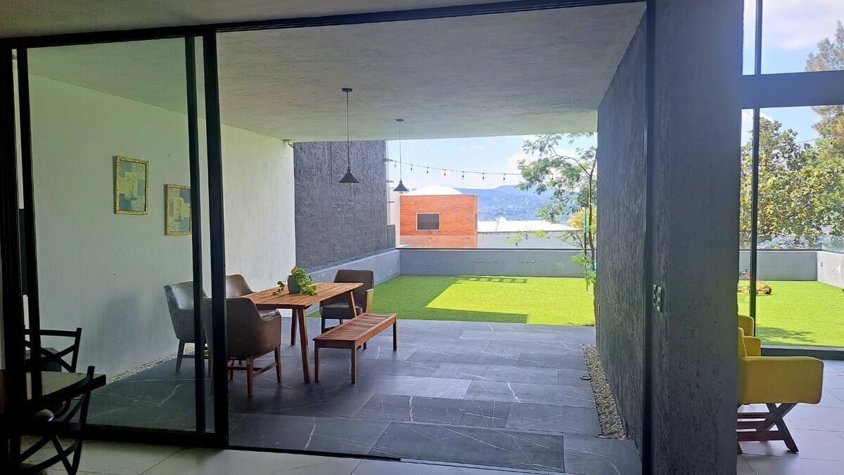 Segunda planta: Cocina, sala, comedor, 1/2 baño, cuarto o posible oficina, alacena amplia, cuarto de lavado, terraza y jardín con vista a la ciudad y al bosque.