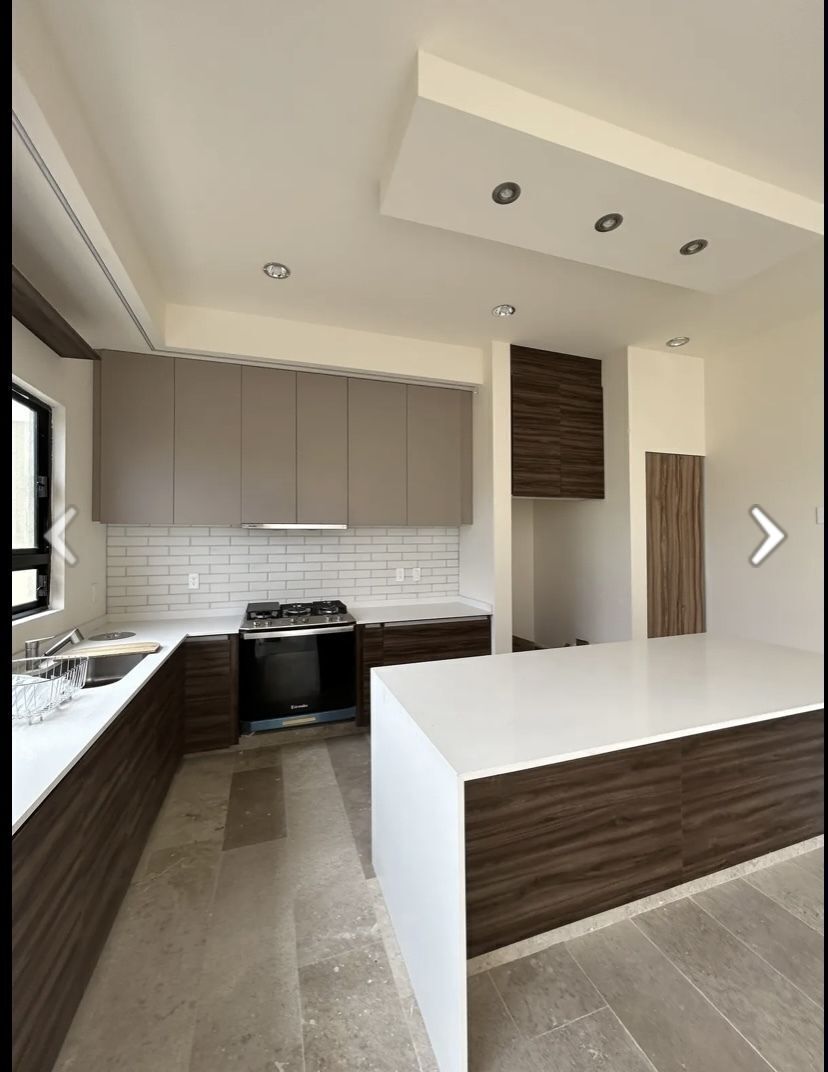 En primero piso, sala, comedor doble altura, cocina abierta con barra de granito y amplia alacena, recamara con baño completo y closet o estudio o sala de tv. estacionamiento para 3 carros, jardin de 45mts.