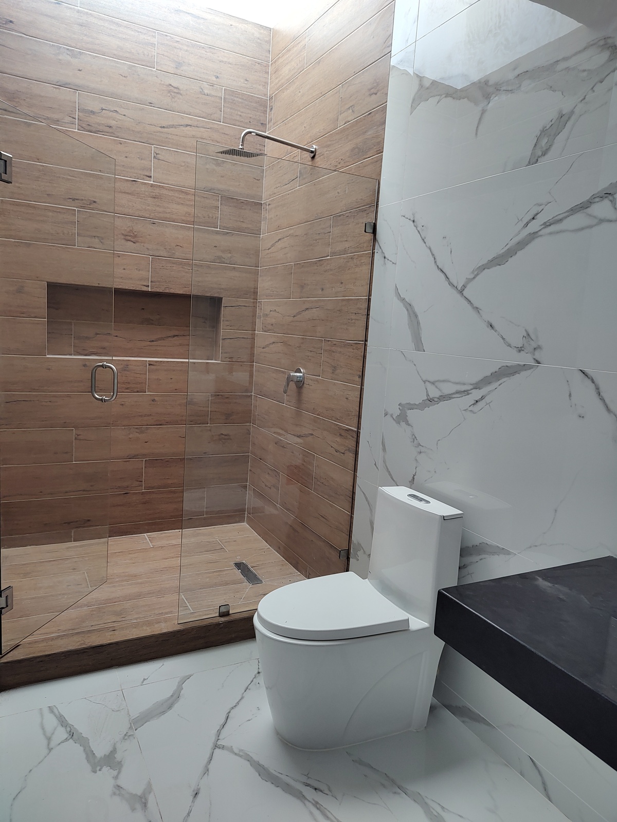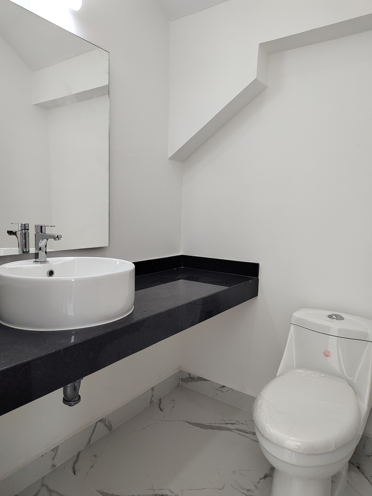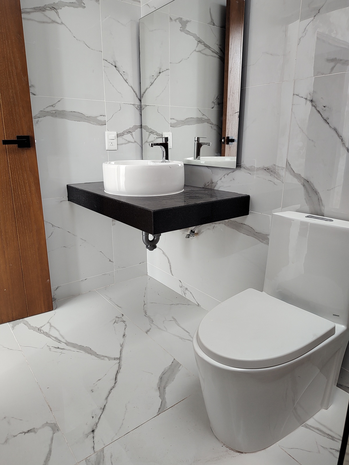 2 baños y medio, equipados con mesetas de granito, vidrio templado en regadera, espejos.
