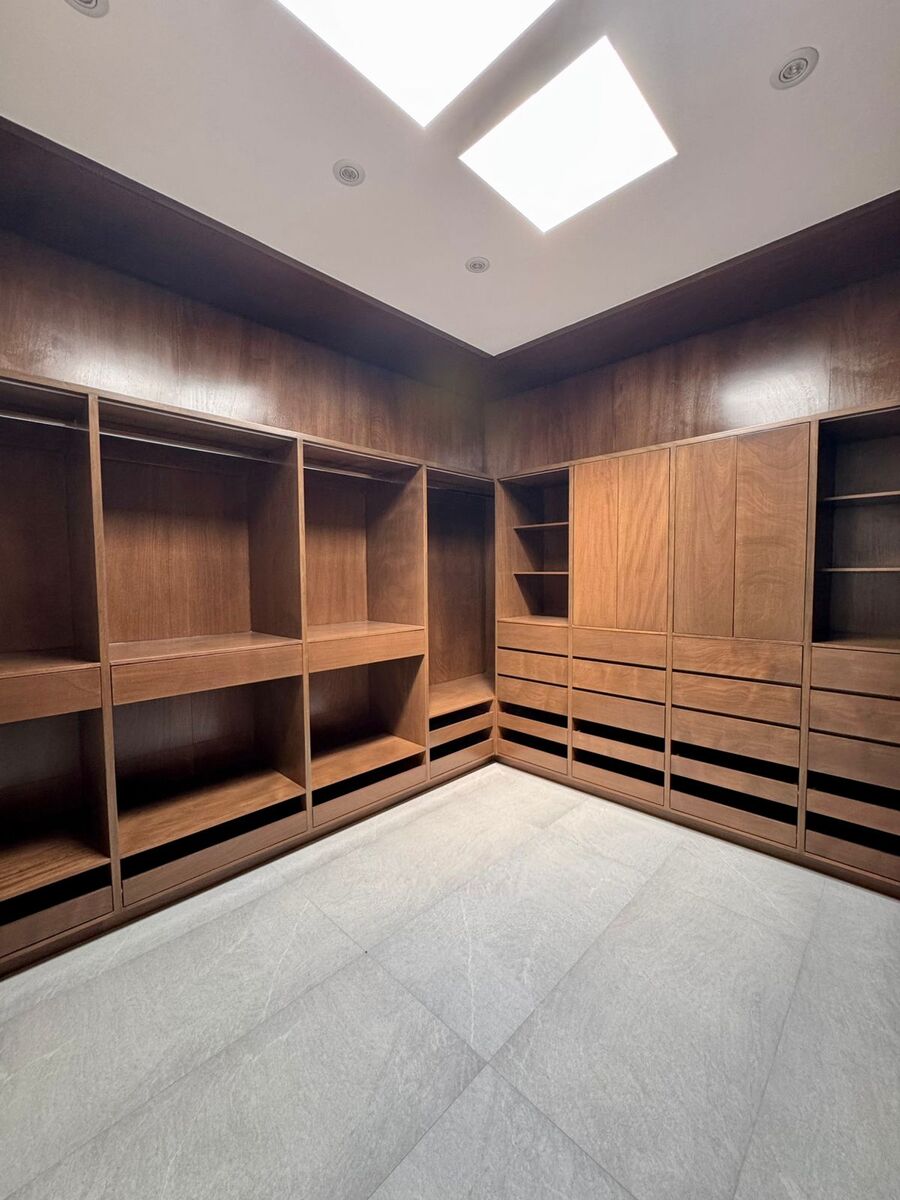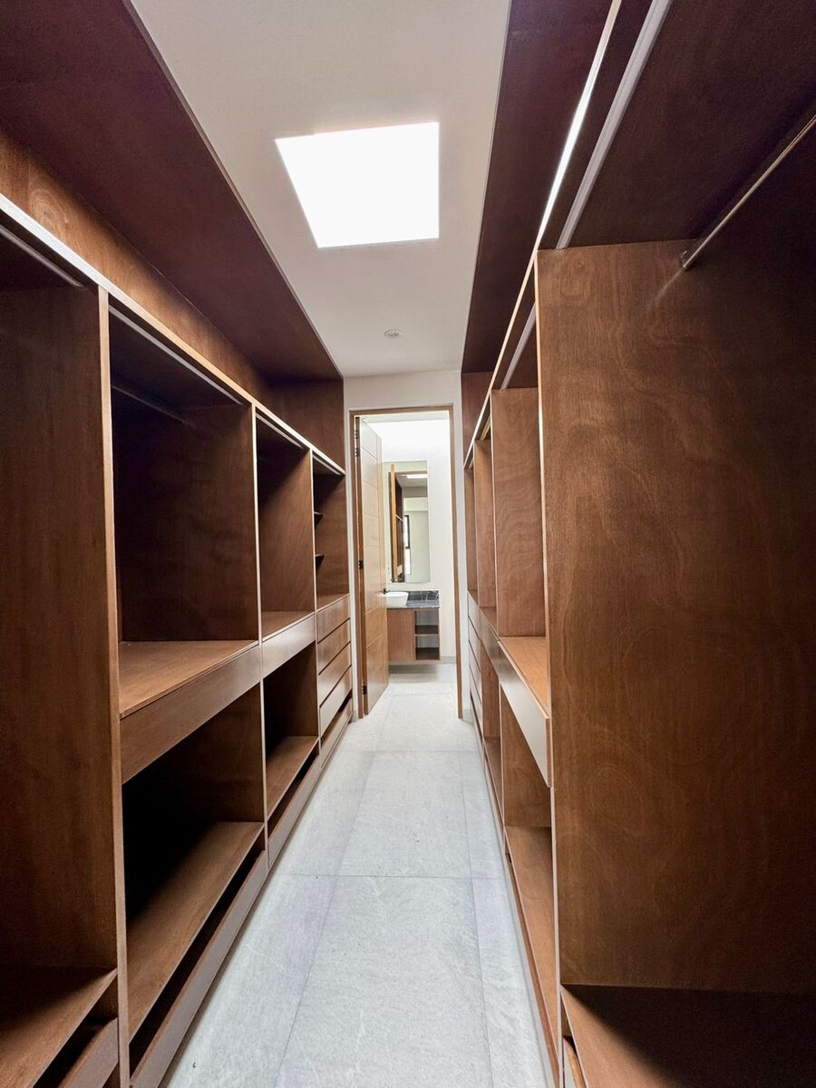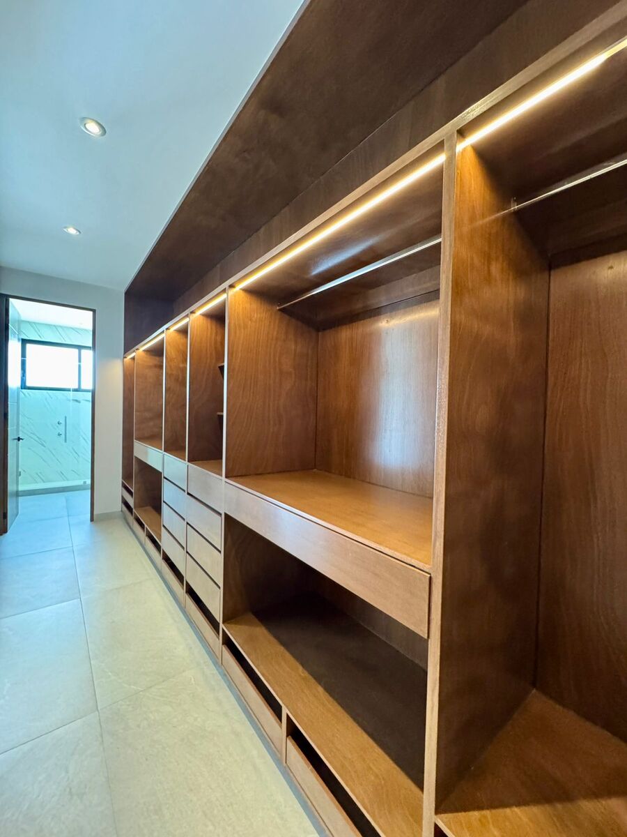 Papel tapiz en muros, cantera, madera, mármol y vestidores de madera con luz indirecta, entre otros.