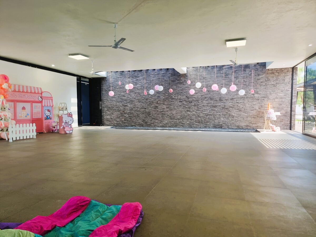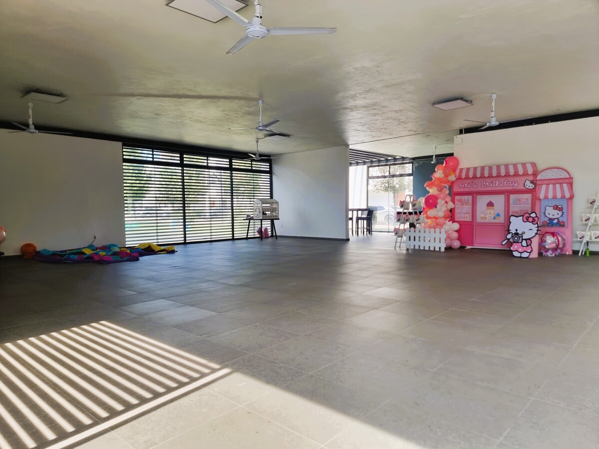 Heated pool with a wading pool, children's play area, covered event terrace with kitchenette, well-equipped gym, bathrooms with showers, security cameras, and electric fence throughout the condominium.