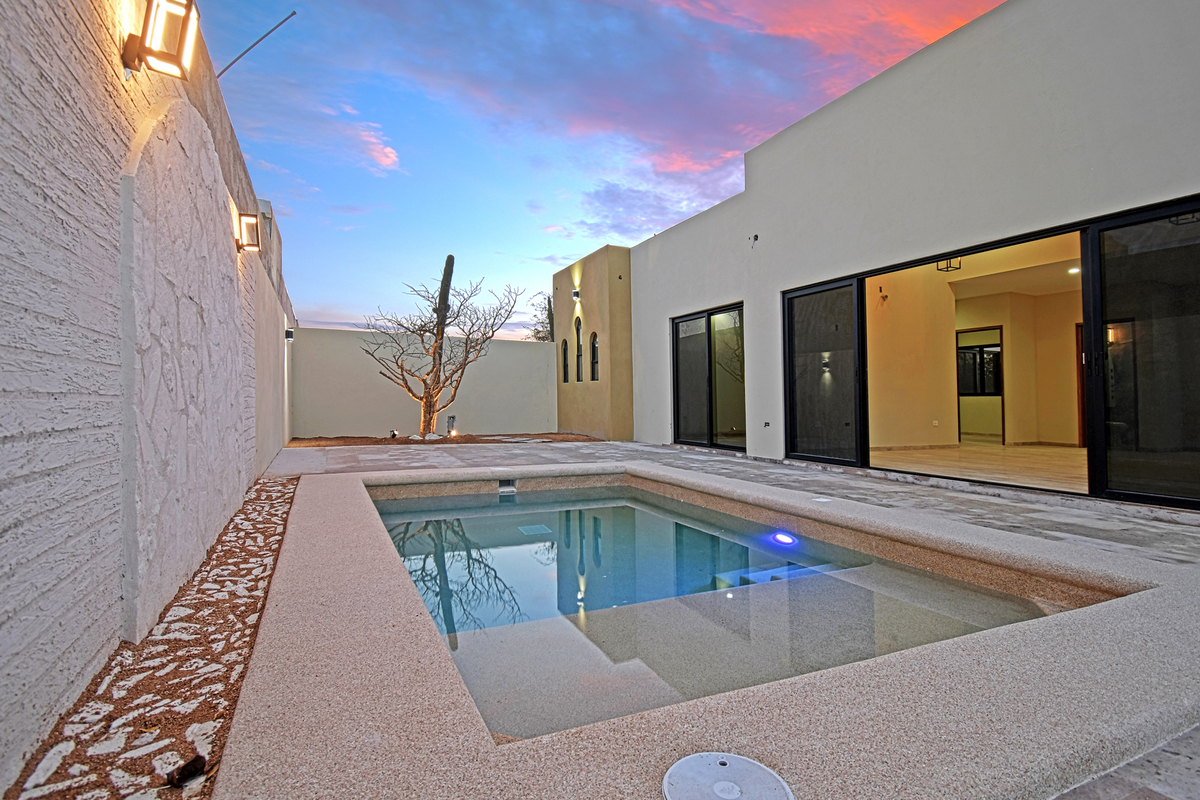 If you´re looking for a home with exclusive design, luxury finishes, and unbeatable layout, discover this stunning residence in one of the most popular neighborhoods in La Paz ''El Centenario''. Every detail has been carefully selected to offer a luxurious living experience.: Marble floors and elegant parotta wood details. Kitchen with granite countertops and island range hood. 161 SQFT heated and illuminated pool surrounded by cantera stone. Two bedrooms with walk-in closets and in-suite bathrooms. One additional bedroom sharing a guest bathroom. Parking for three vehicles and one boat. Facade and backyard with natural stone cladding. Laundry room, pantry, and pressurized water system for optimal supply.