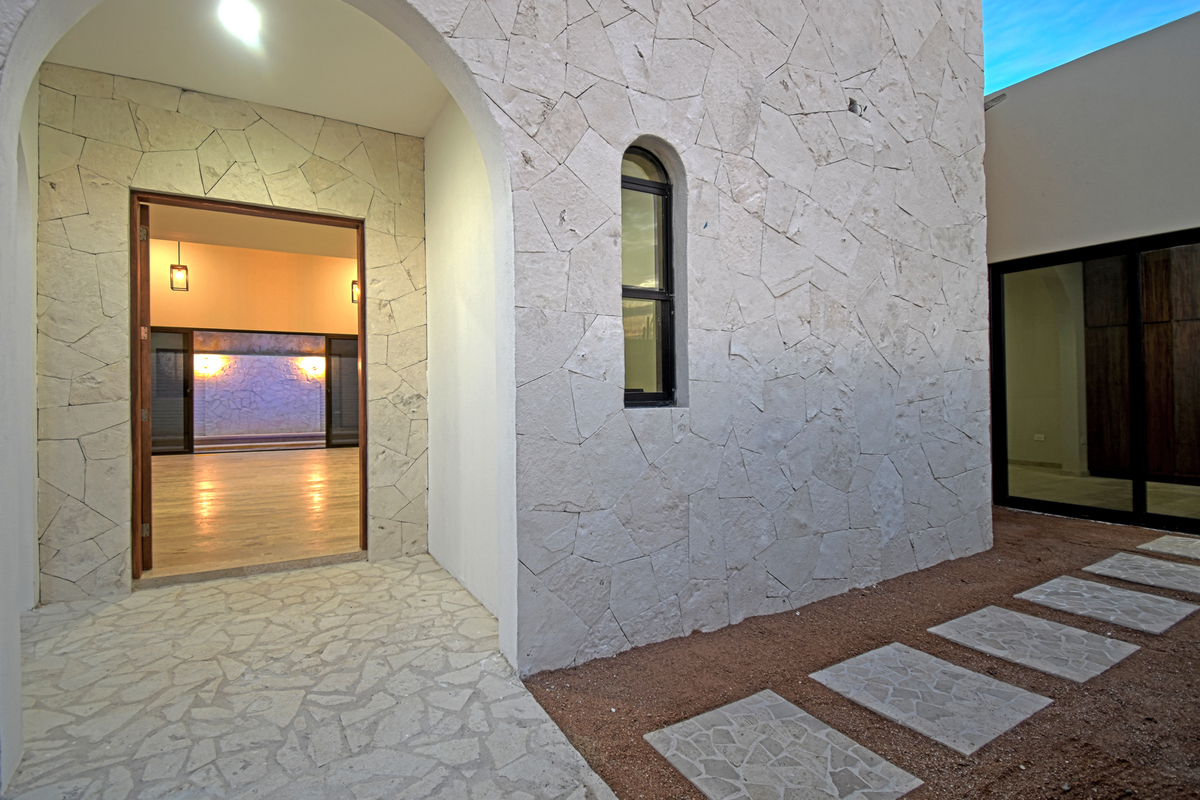 -The floor is travertine marble, the pool area has Piñón Cantera, and the entrance facade is Galarza slate stone.