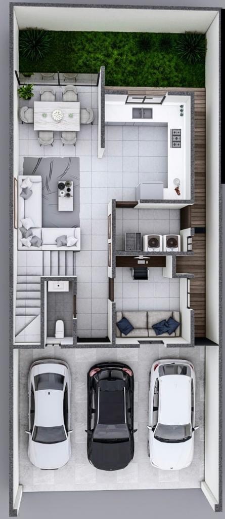 En planta baja, cochera 2 autos, sala, comedor, cocina 1/2baño, lavandería y patio.
