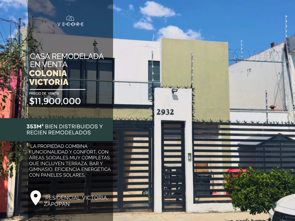 PRICE AND AVAILABILITY SUBJECT TO CHANGE WITHOUT NOTICE.Casa remodelada con excelente diseño, amplios espacios y acabados de alta calidad en la Colonia Victoria, Zapopan. La propiedad combina funcionalidad y confort, con áreas sociales muy completas que incluyen terraza, bar y gimnasio, además de un moderno equipamiento de seguridad y eficiencia energética con paneles solares.