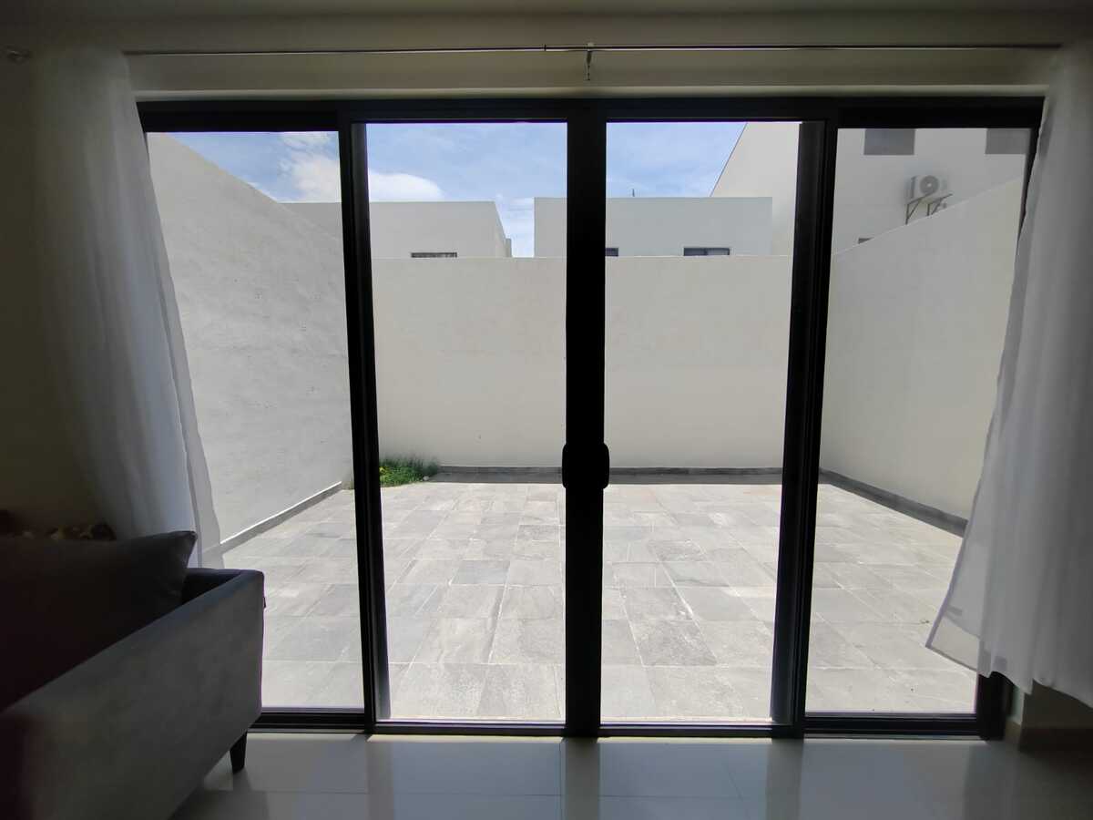 Cochera doble techada, sala, comedor, cocina equipada, lavandería, 1/2 baño y patio.