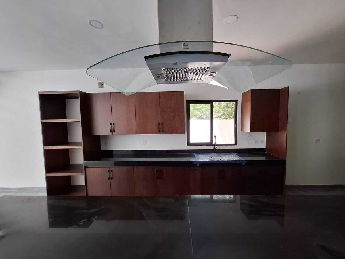 -Cocina vestida con meseta de granito, equipada con accesorios, estufa, extractor, horno, marca Teka, y gavetas en madera de Tzalam.