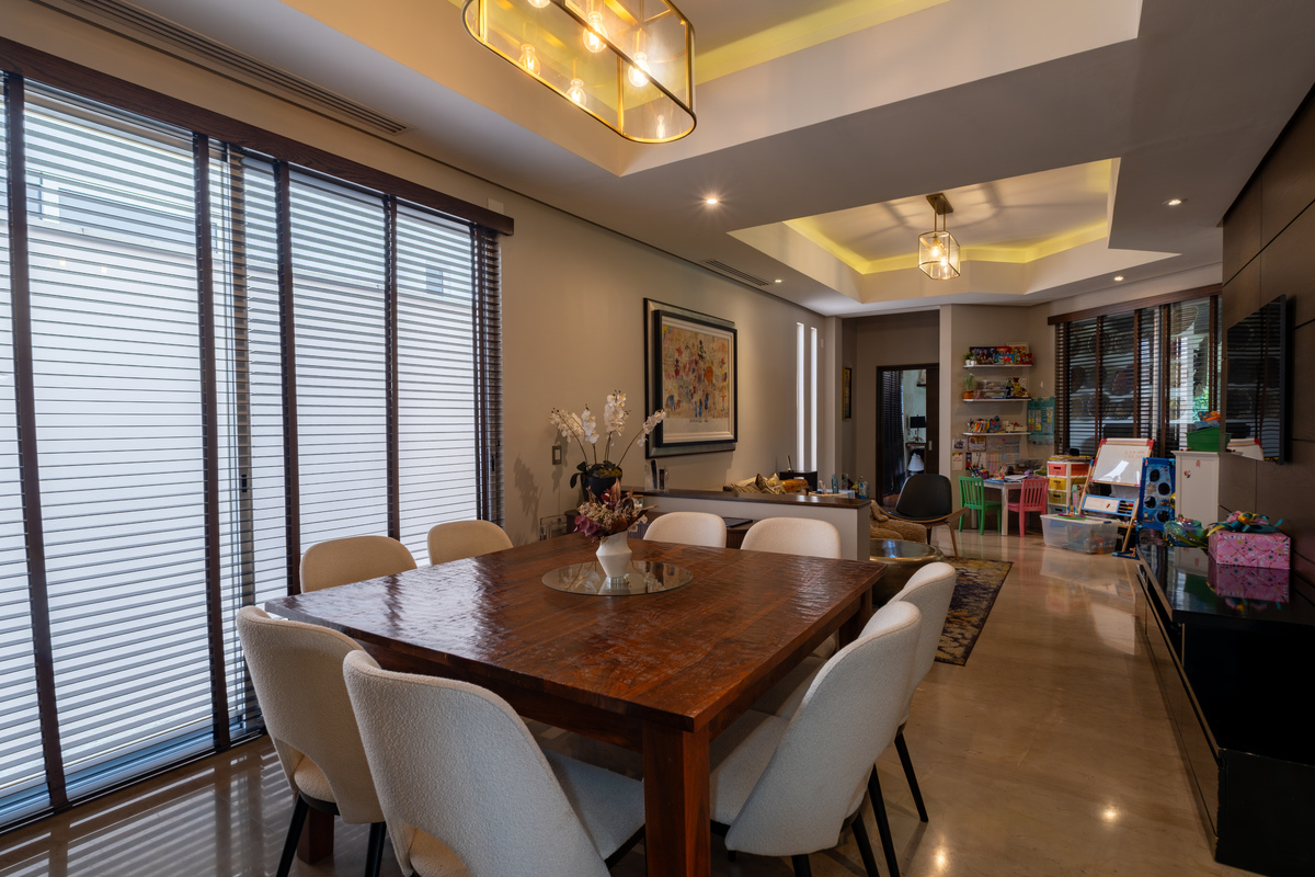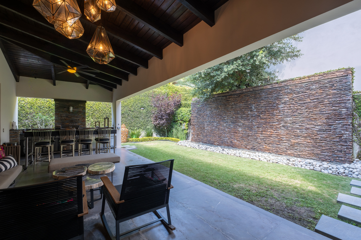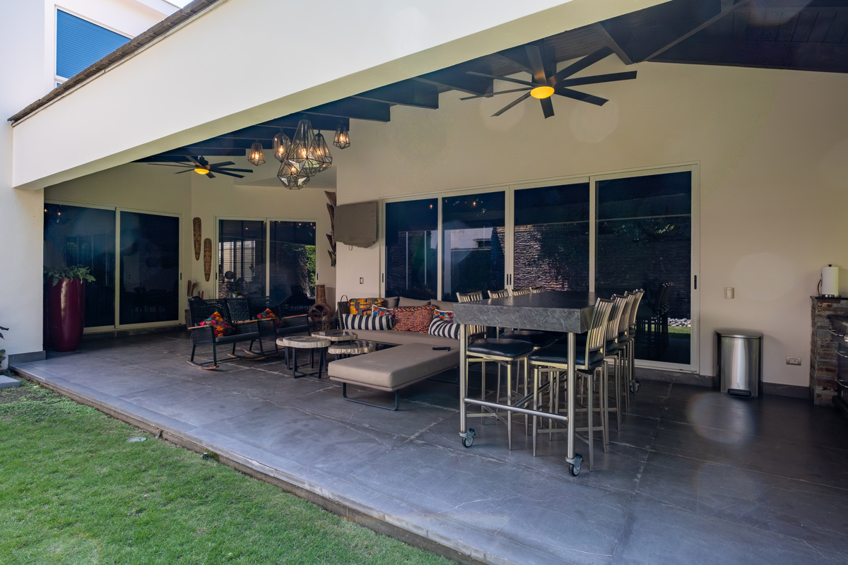 Esta magnífica casa construida sobre un terreno de 500 m2 y con 554 m2 de construcción, cuenta con excelentes acabados y varias áreas sociales en la planta baja como un vestíbulo para recibir visitas con su medio baño, amplia sala - comedor, antecomedor, área de TV y una espaciosa cocina. En la parte posterior de la primera planta se encuentra una terraza exterior techada con comedor y asador rodeado de un hermoso jardín y con una amplia fuente. Al lado de la terraza hay un espacioso bar con TV y su medio baño que se integran al área del comedor con el asador exterior.
