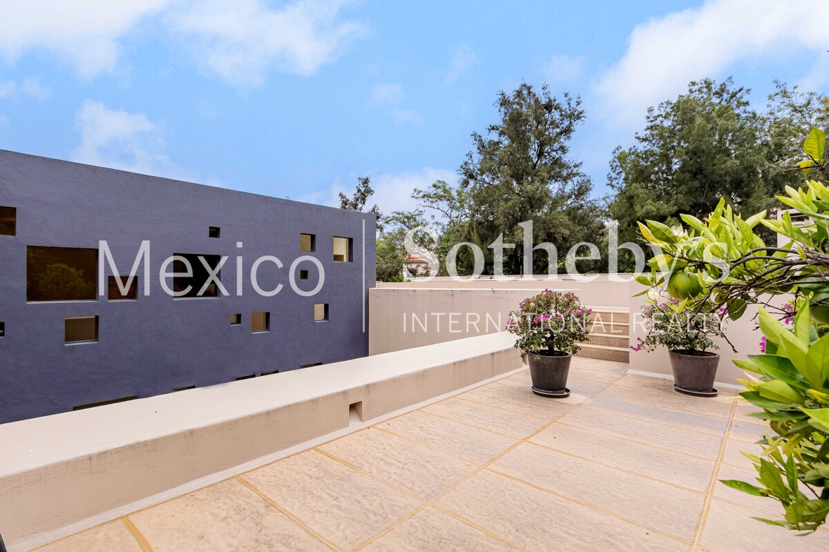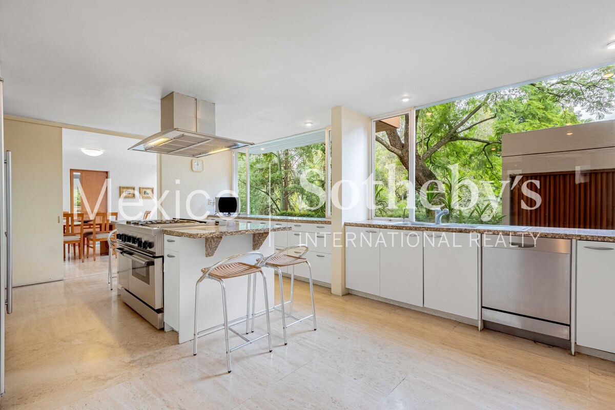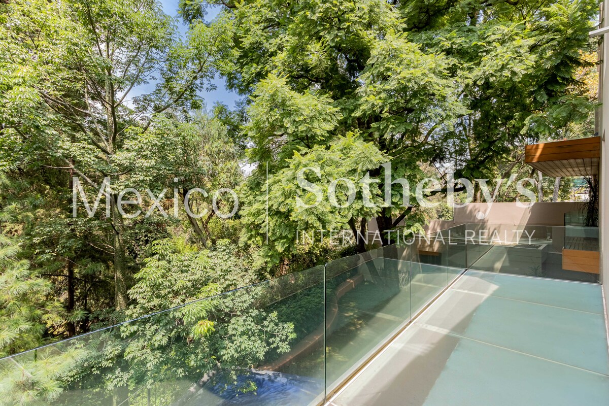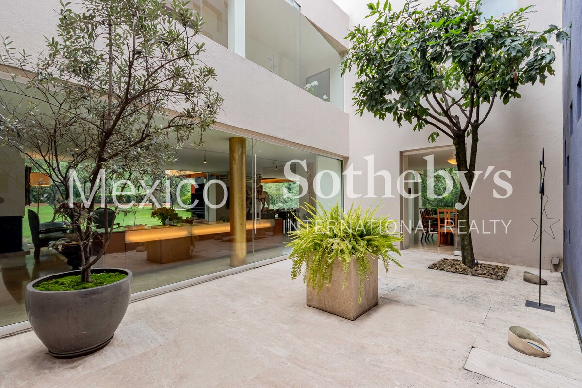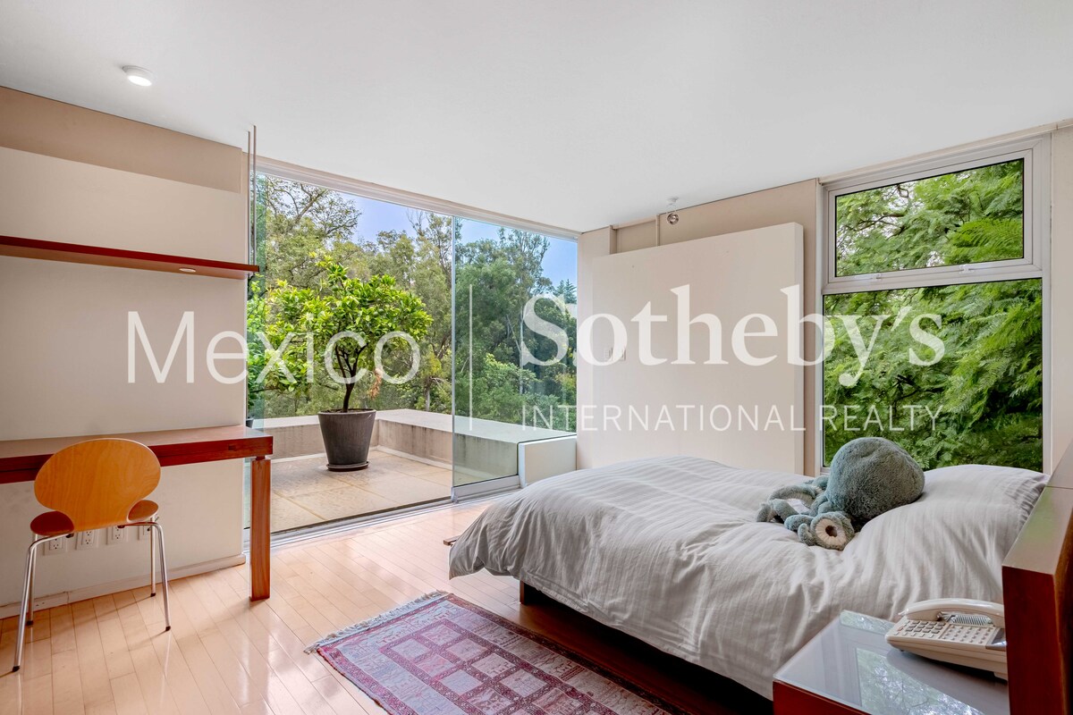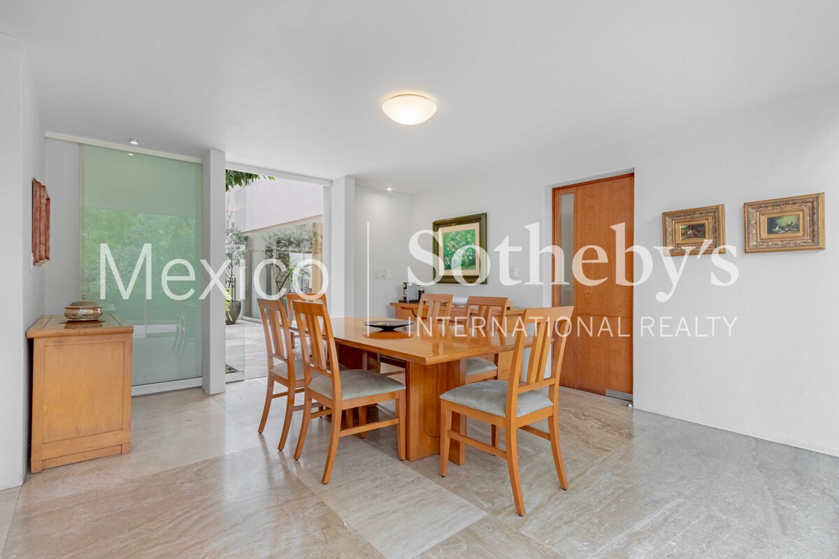La zona privada ofrece cuatro recámaras, incluida una suite principal con terraza, vestidor/gimnasio y baño de lujo. Complementan la casa un cuarto de servicio con estancia, cuarto para chofer y un taller de herramientas.