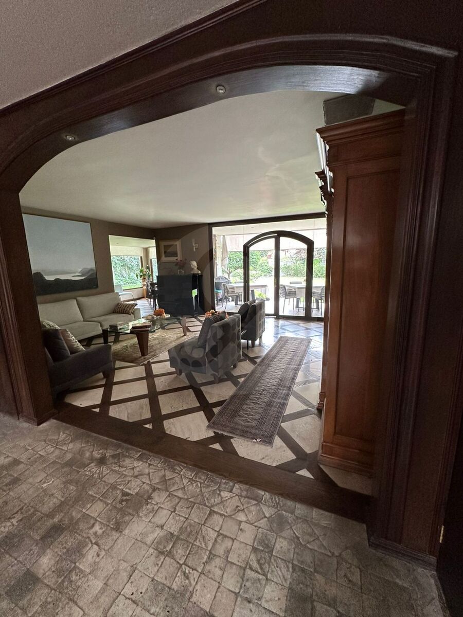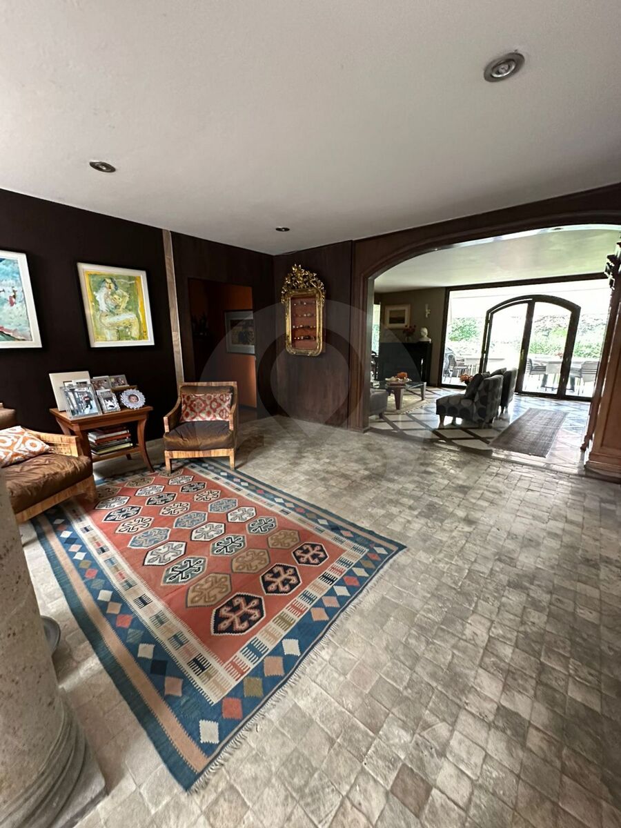 Double-height foyer, living room and dining room leading to a covered terrace and the garden,