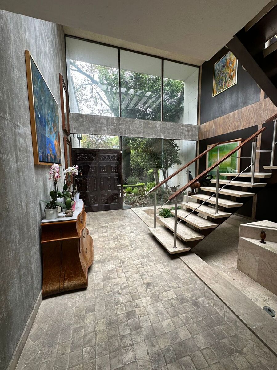 vestíbulo doble altura, estancia y comedor a terraza techada y al jardín,