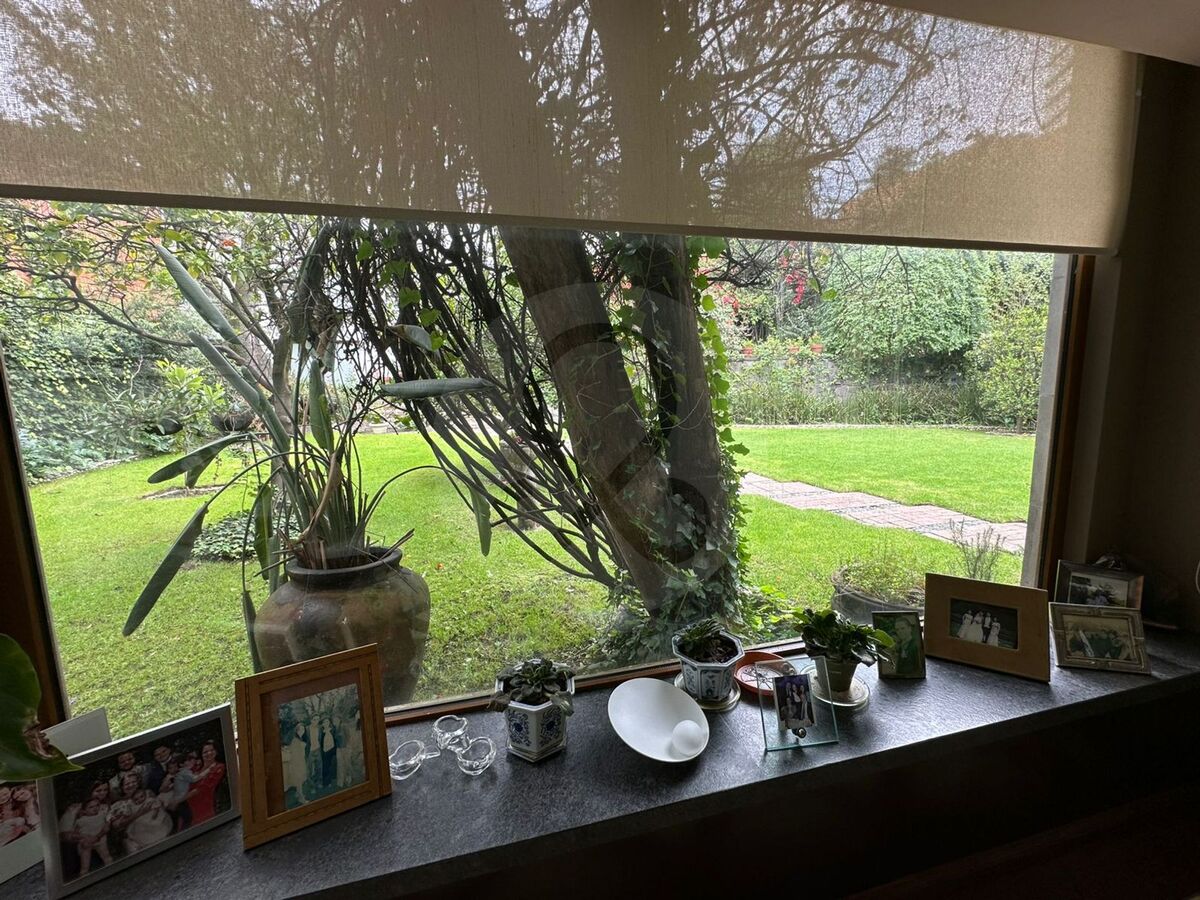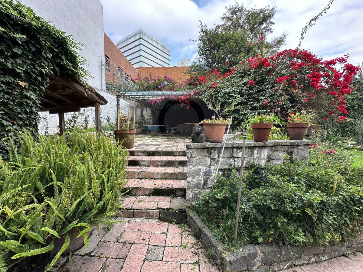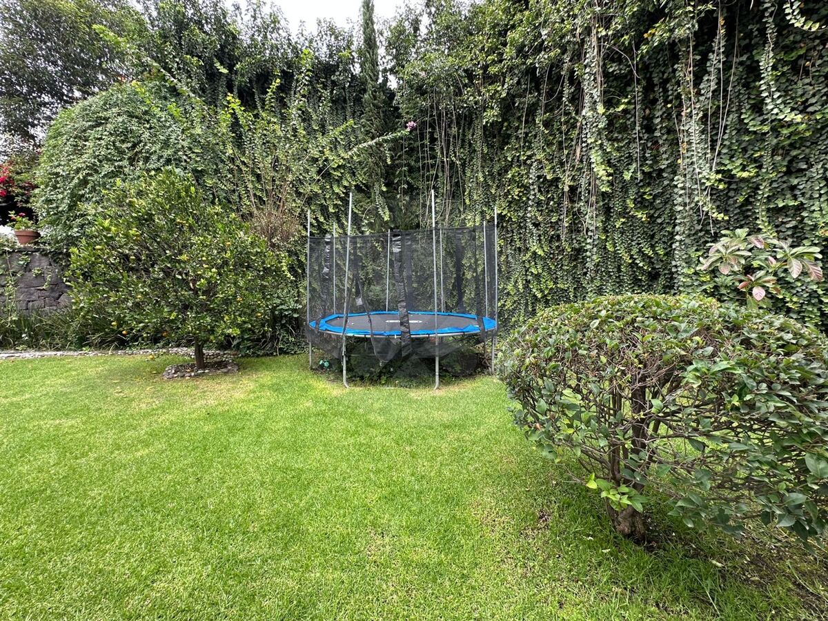 Área jardinada amplia al frente y gran jardín posterior.