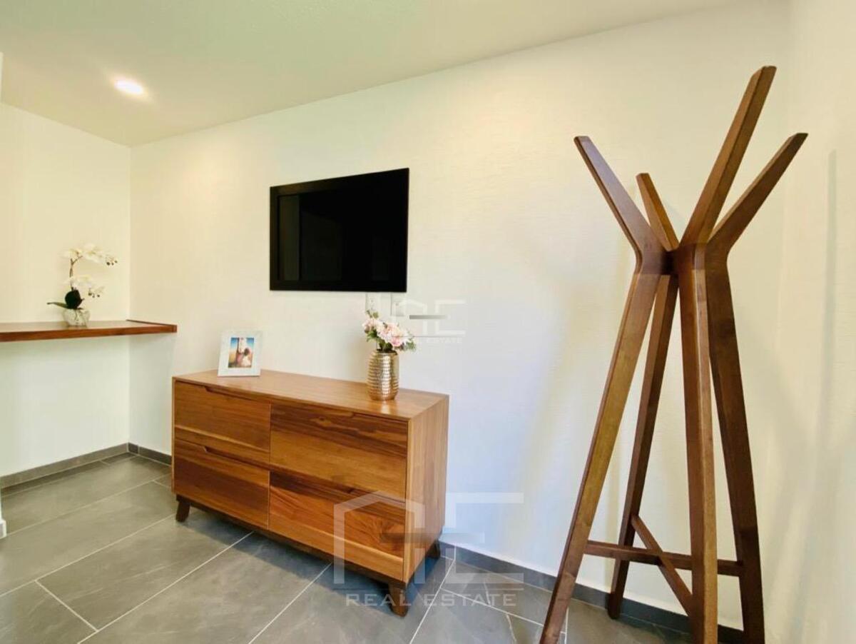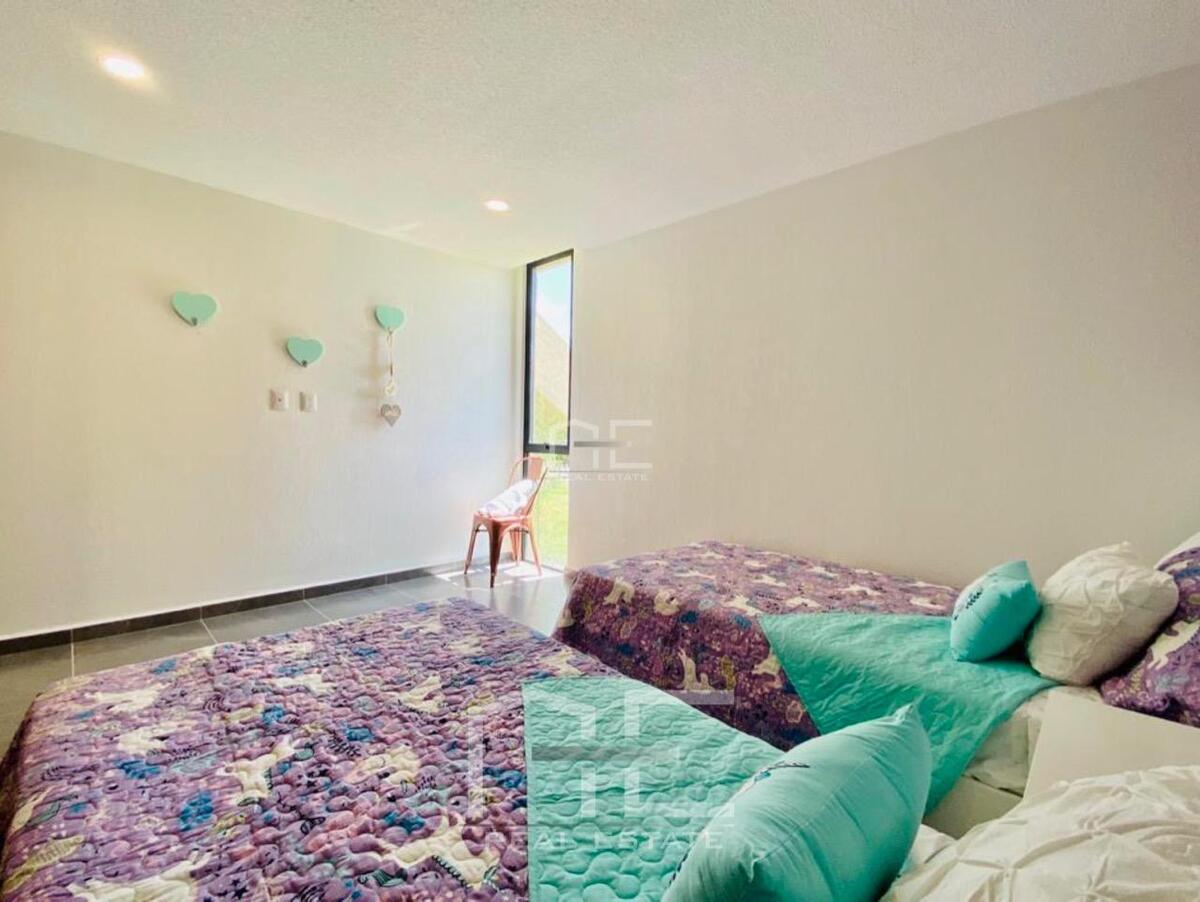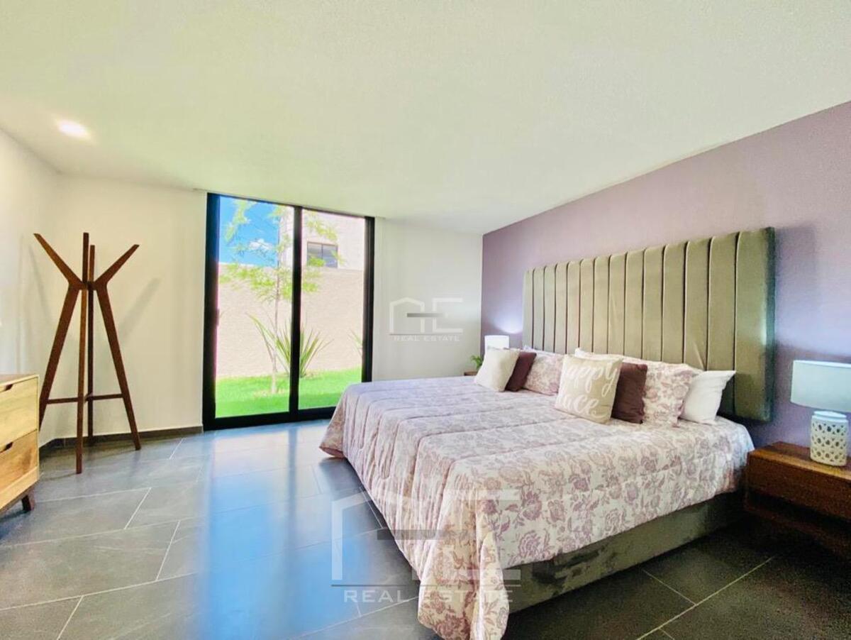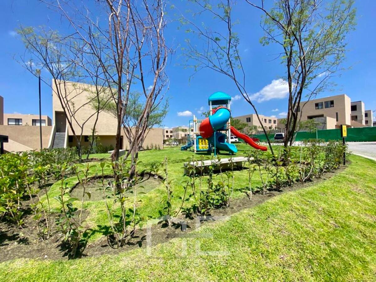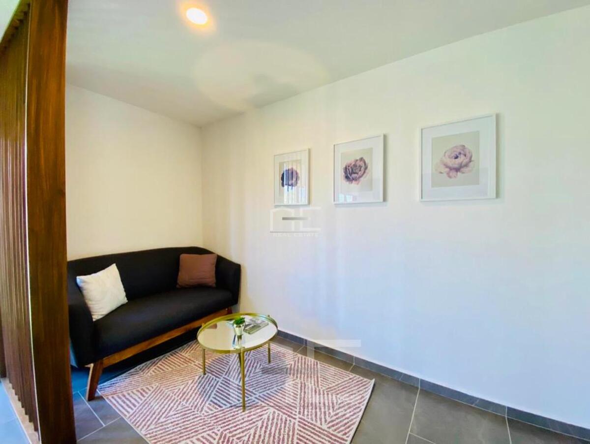 Cuentas con filtro de seguridad en la privada, amplios espacios: Cocina Equipada con Barra Desayunadora cubierta de Granito varias alacenas y espacios de almacenamiento, áreas de sala y comedor integradas con vista al gran Jardín de 70m2, área de lavado cerrada, pequeña área de TV o Home Office, garage para 2 autos.