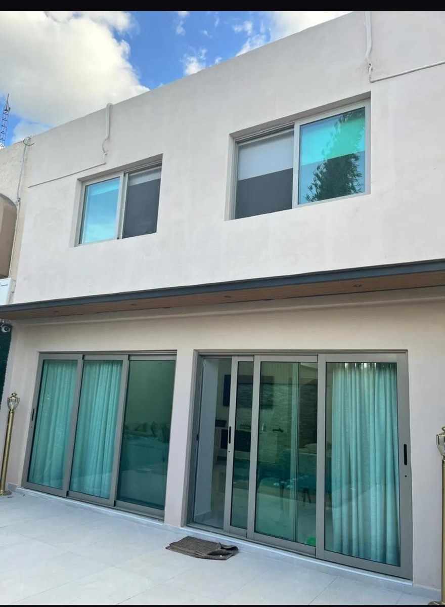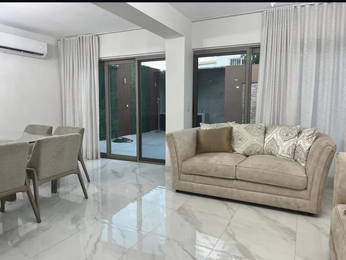 Amplia sala y comedor con iluminación natural y grandes ventanales con vista al jardín y alberca.