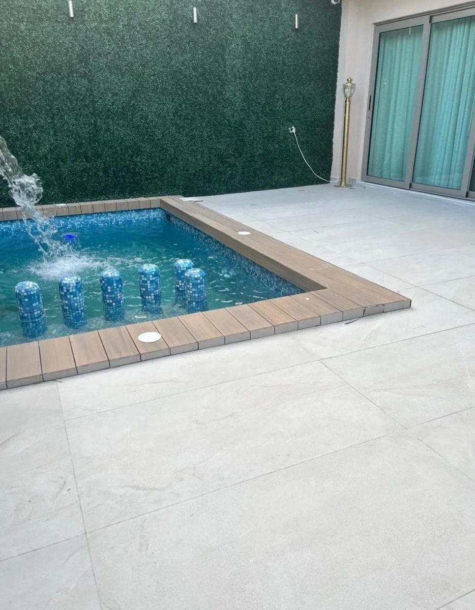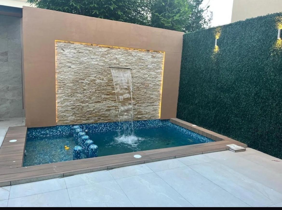 Patio con alberca, cuarto de máquinas y baño de visitas.