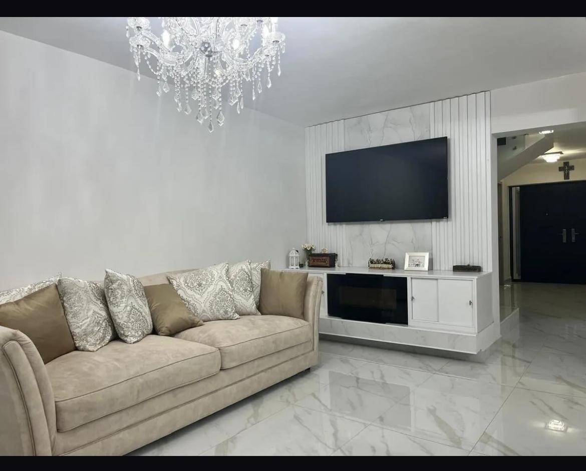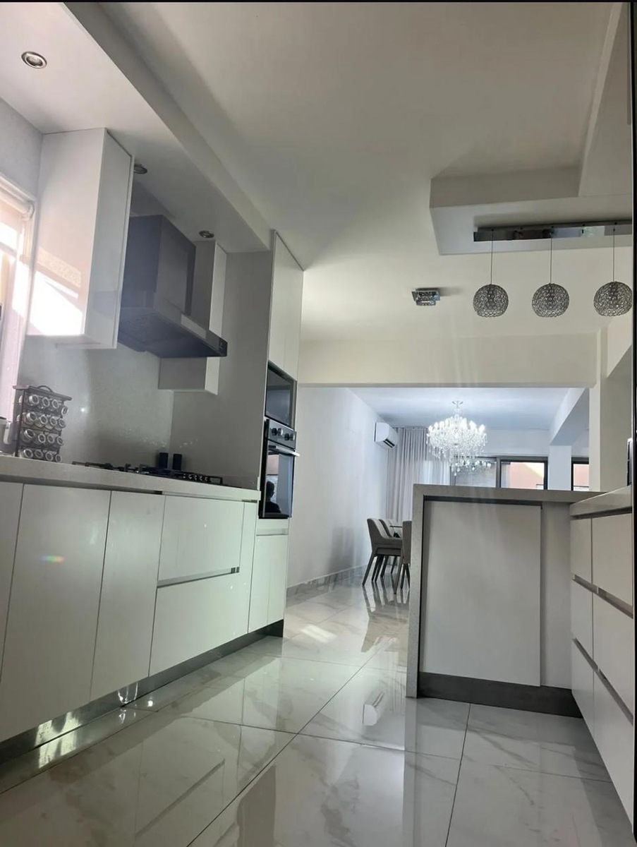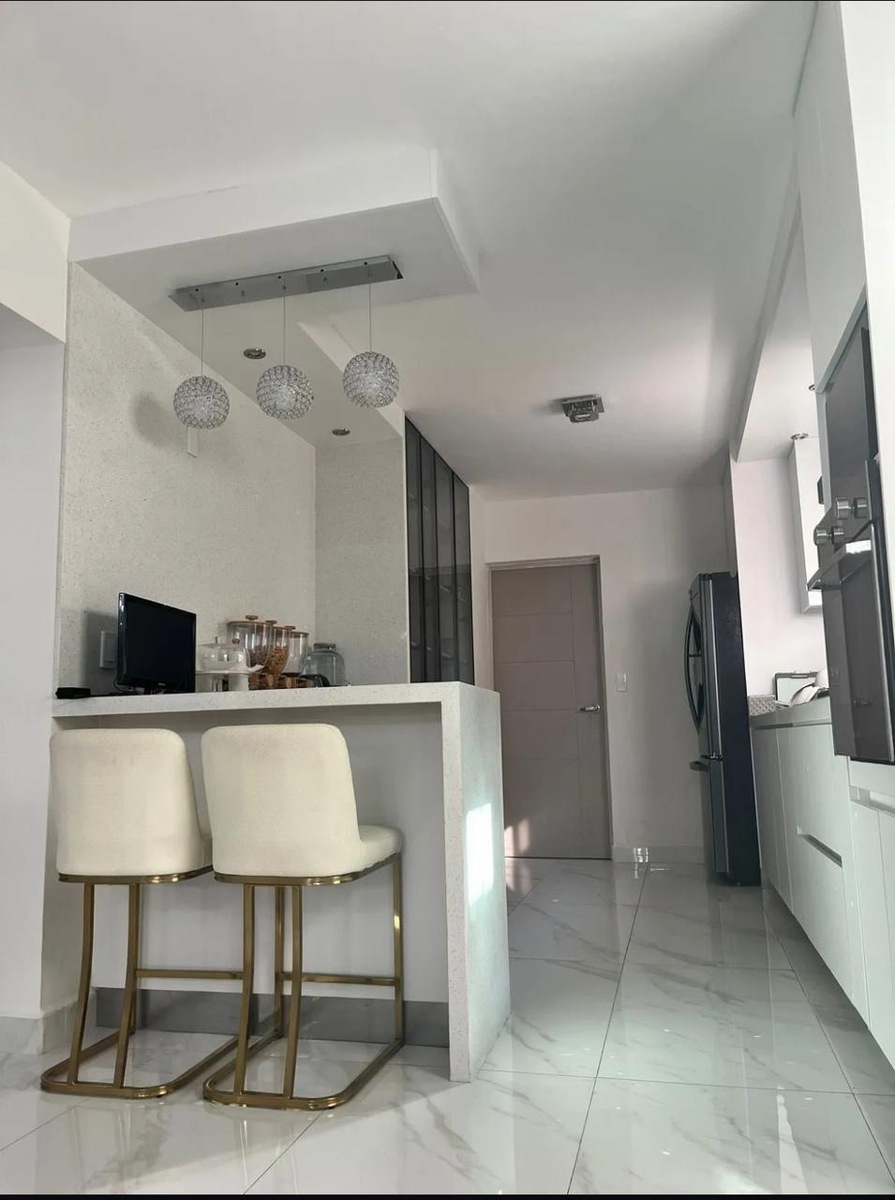 Cocina integral con cubierta de granito blanco y detalles plata, equipada con estufa, horno, campana y refrigerador.