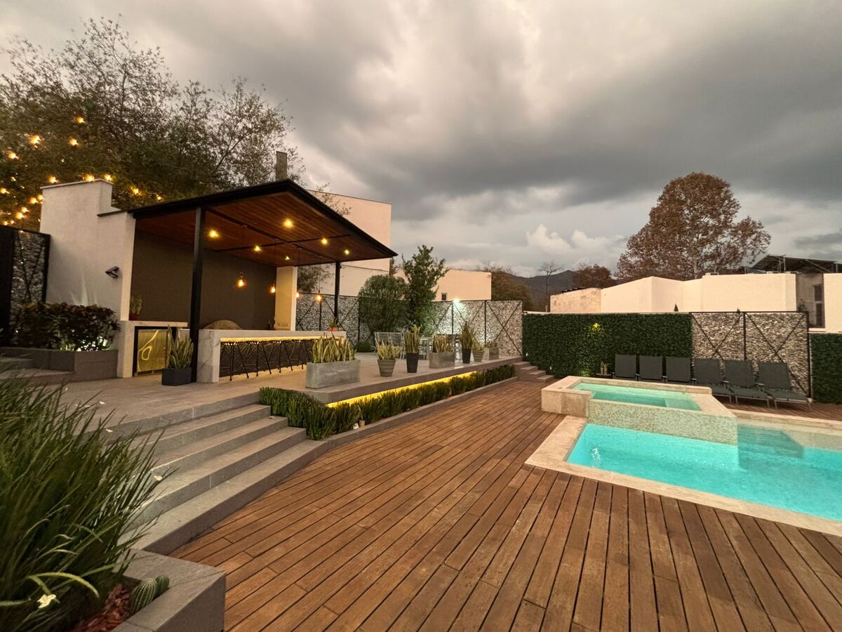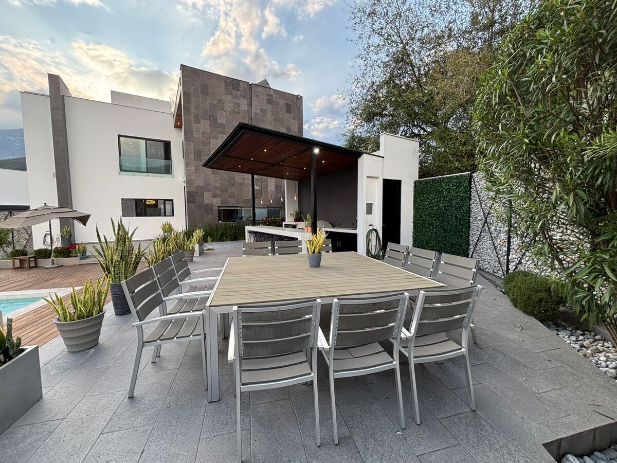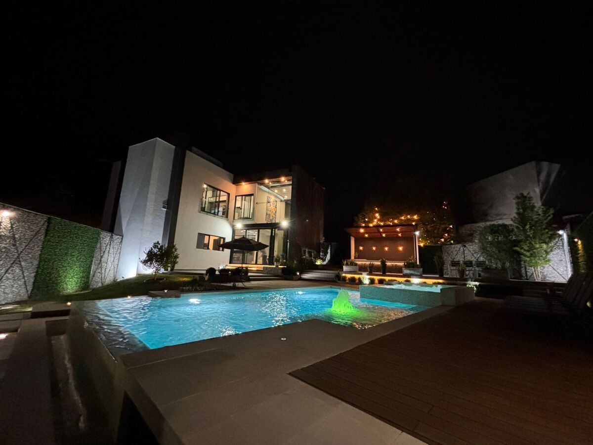 - Primer Nivel: Cochera techada para 3 autos, recibidor, baño de visitas, sala-comedor con muebles BoConcept (doble altura), cocina equipada, lavandería, cuarto de servicio, y un patio con alberca, barra con asador y baños completos.