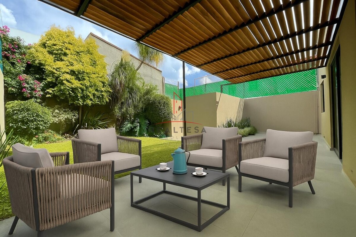 · Terraza con pérgola de acero y madera hacia el jardín.