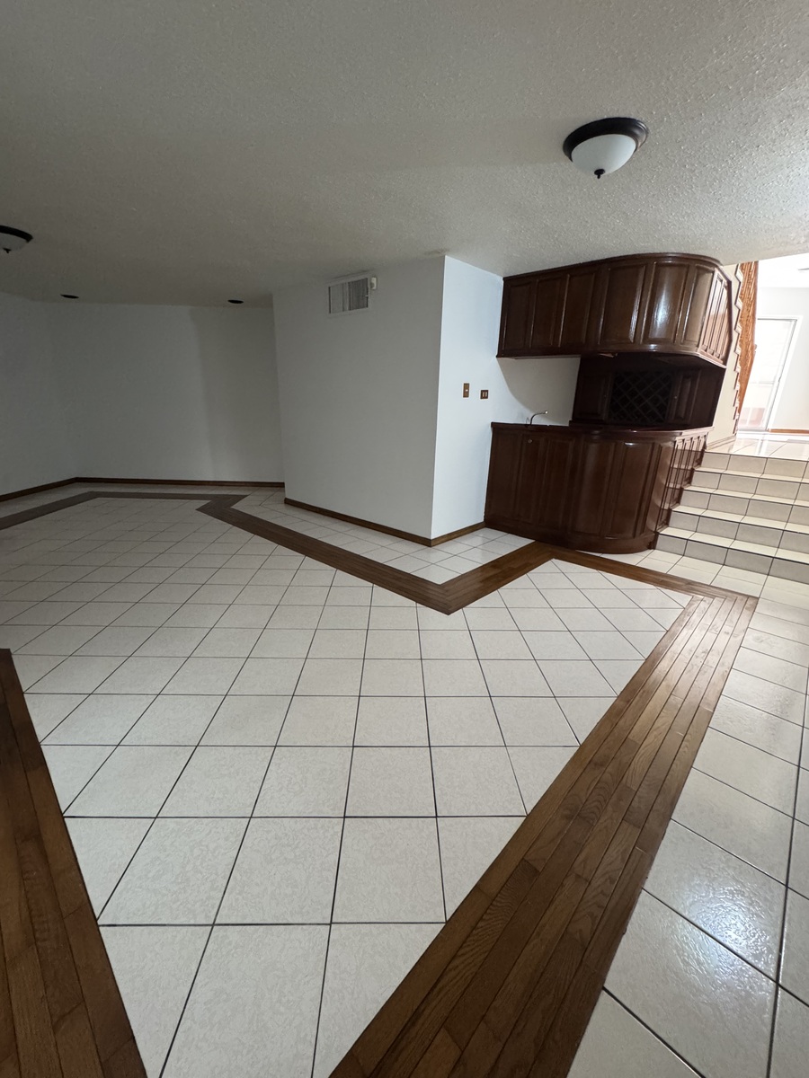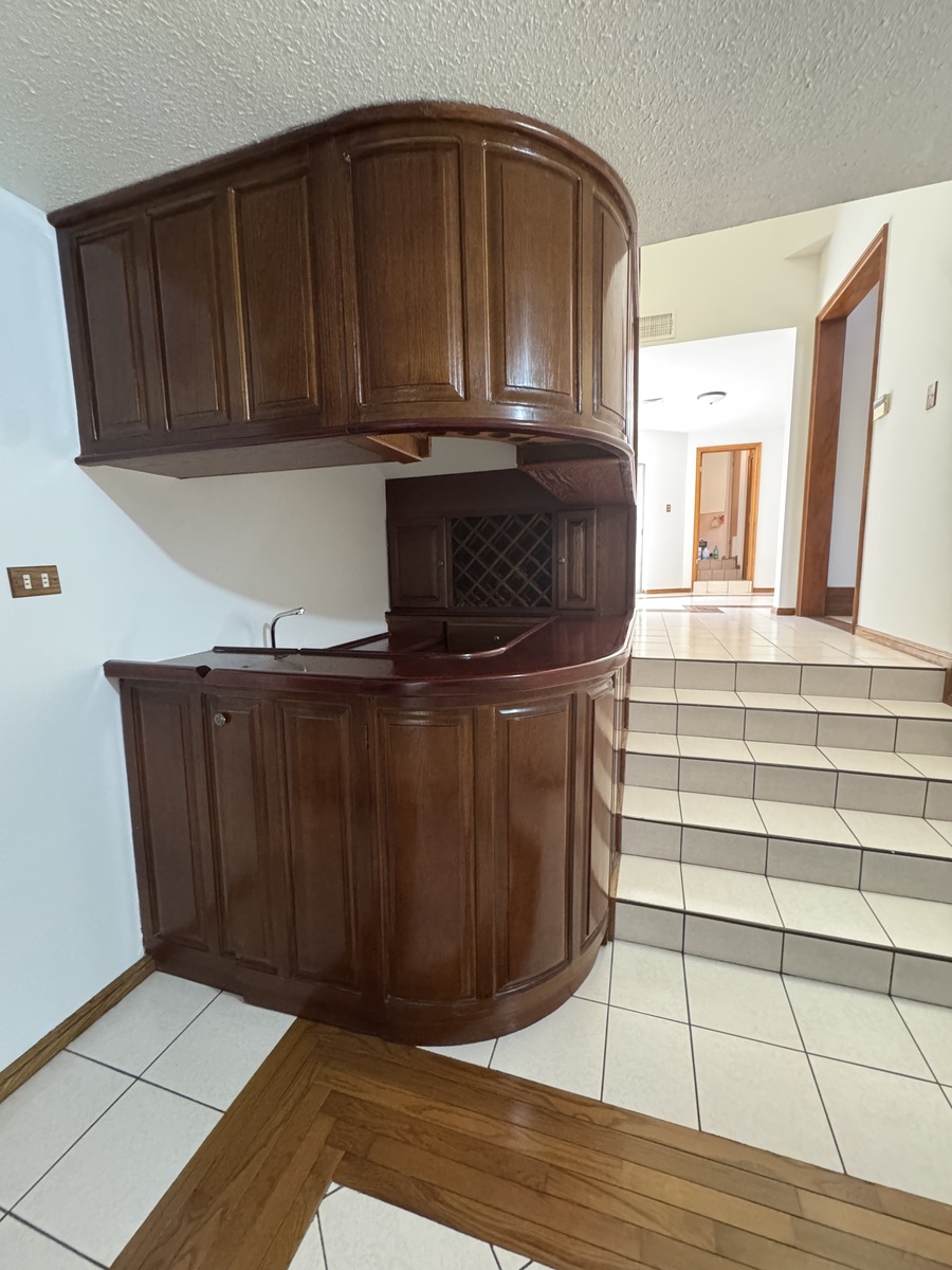 Cuarto de juegos con chimenea y con barra de madera y tarja