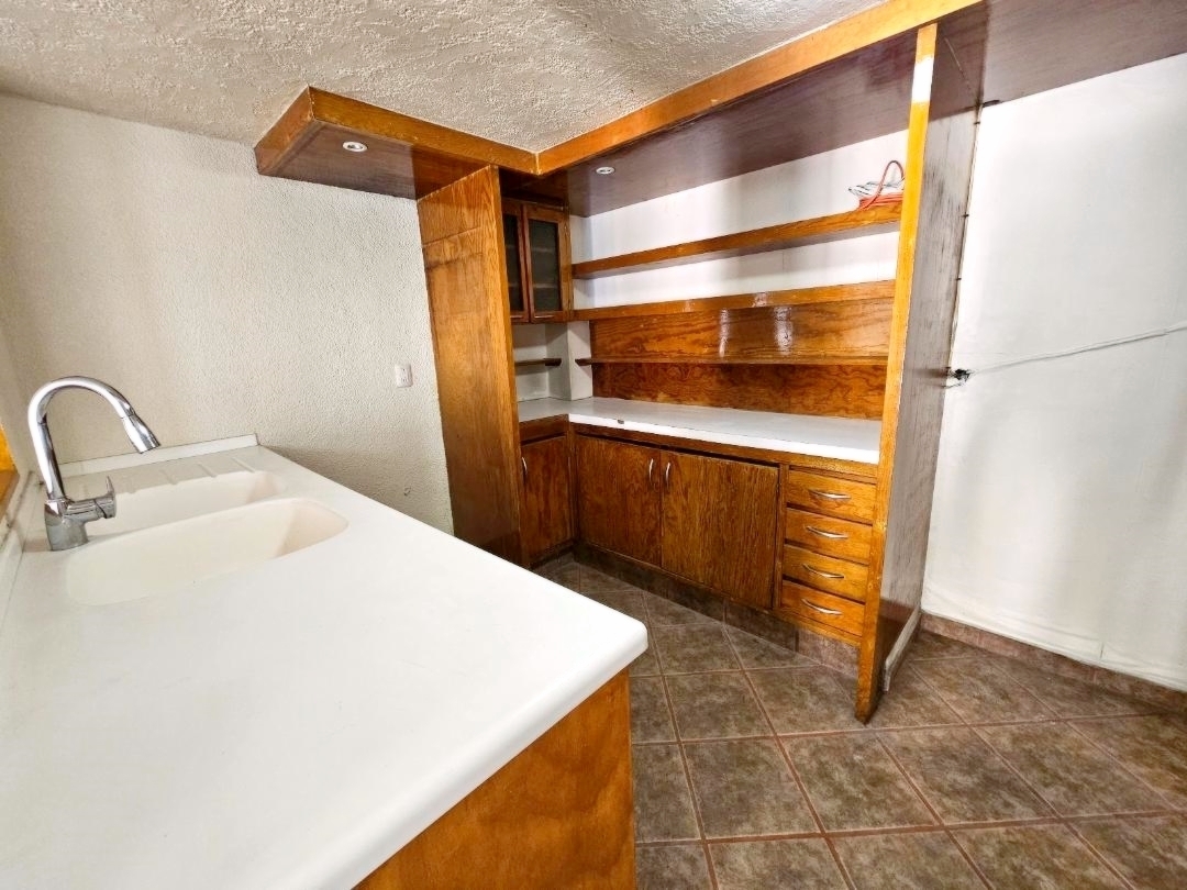 Kitchen with corian countertop and wood finishes. Space for breakfast nook. Entrance from the garage.