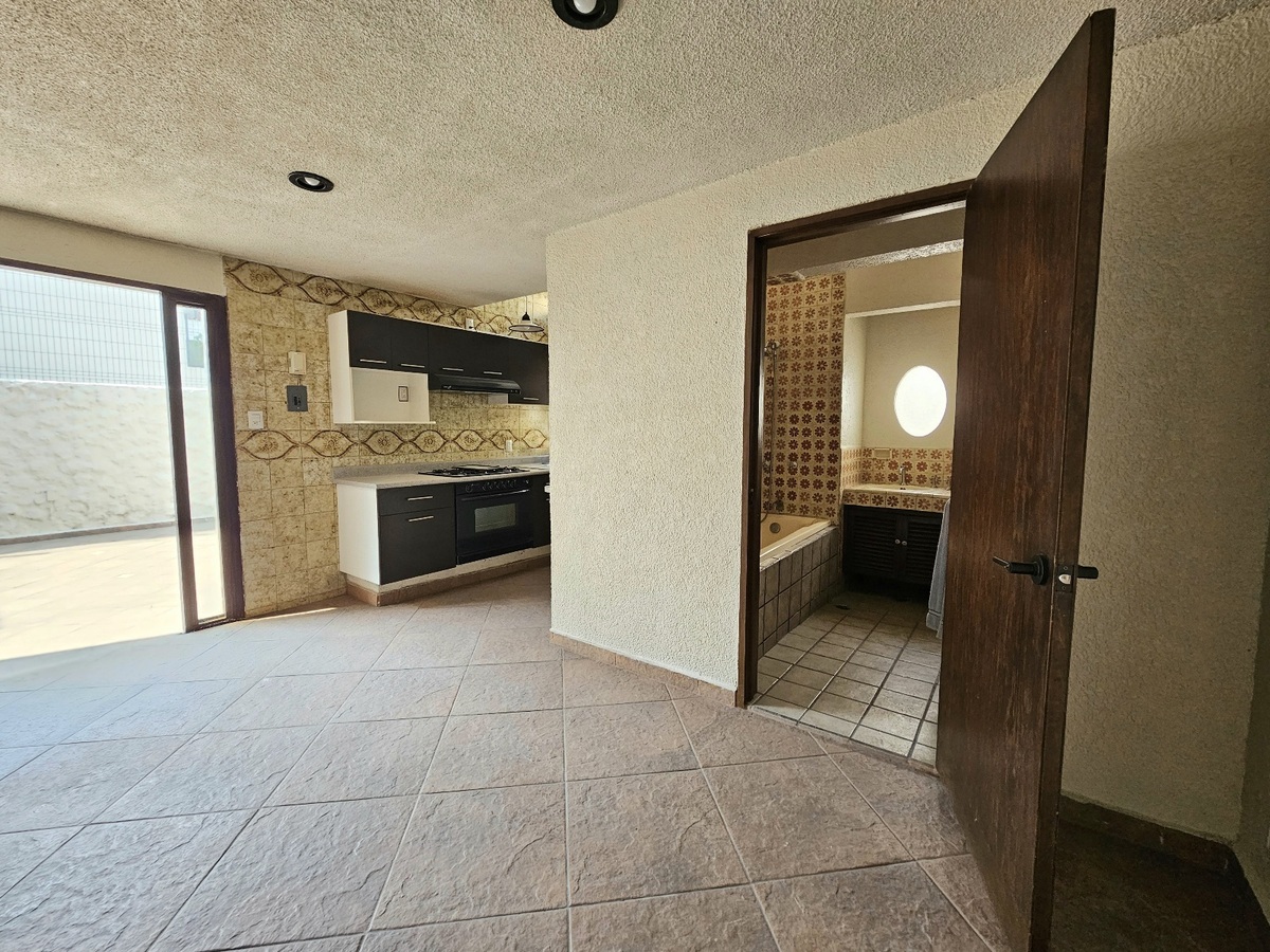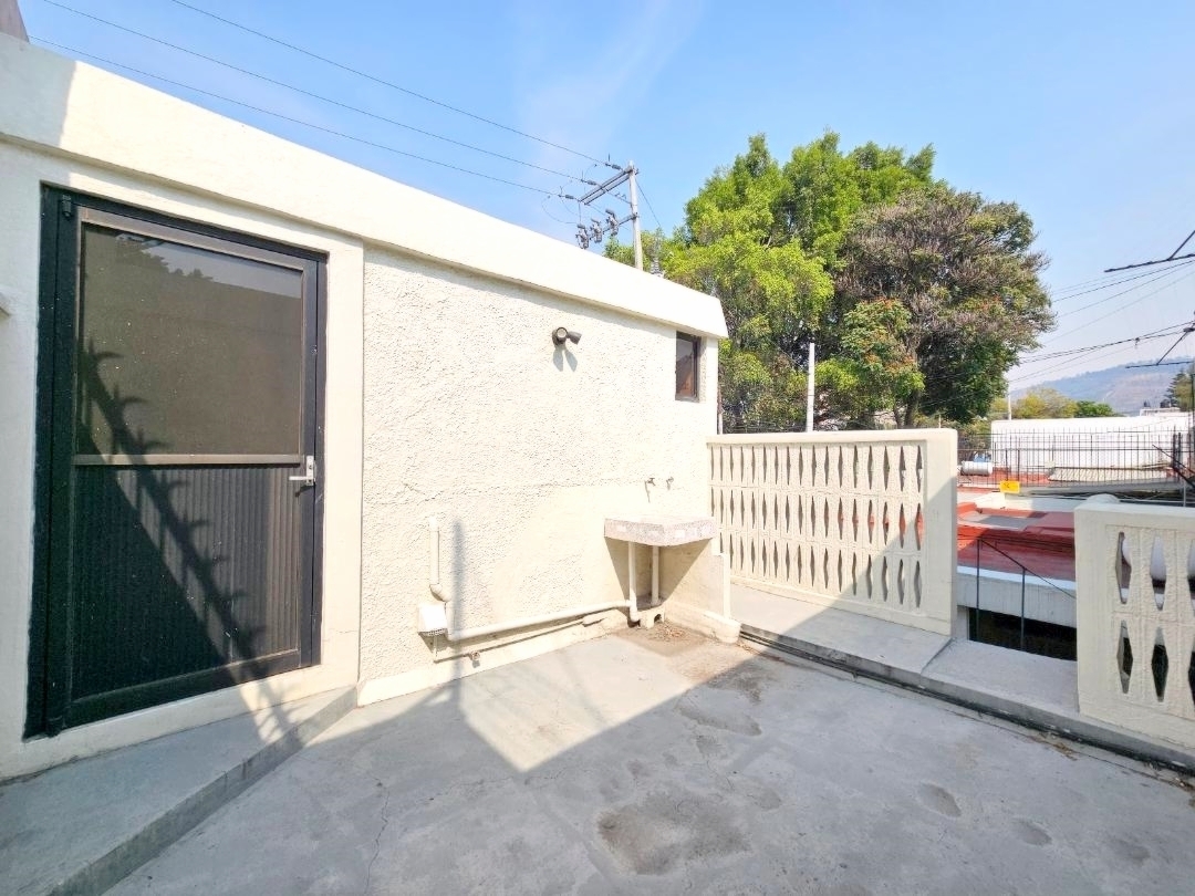 En el patio trasero, que es grande, está la casa independiente, tiene sala comedor y cocina abierta. Baño completo y bodega. En segundo nivel un estudio y una recámara con clóset y balcón.