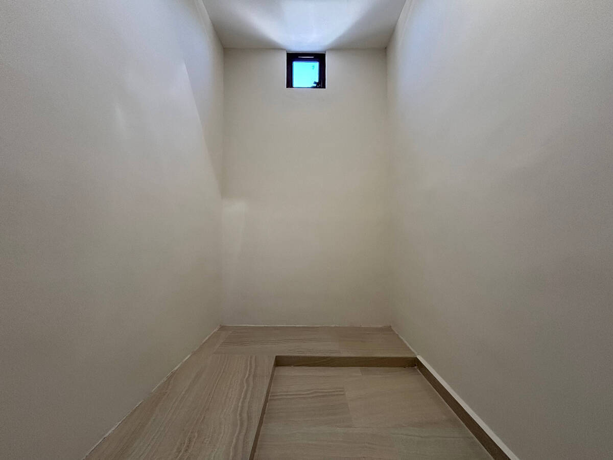 - Bathroom coverings with Fiorito travertine marble in the shower area.