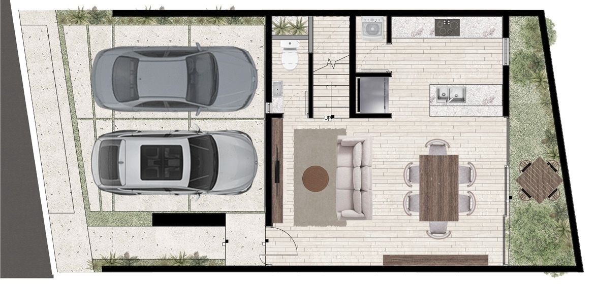 Cochera techada para 2 vehículos | Área para centro de lavado | Cocina con barra desayunadora | Sala-Comedor | Medio baño de visitas | Área de jardín.