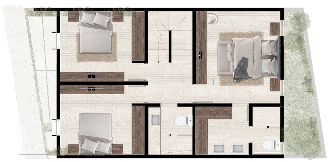 Área de vestíbulo | Recámara principal con clóset vestidor y baño completo | Dos recámaras secundarias con clóset | Baño completo para las dos recámaras secundarias.
