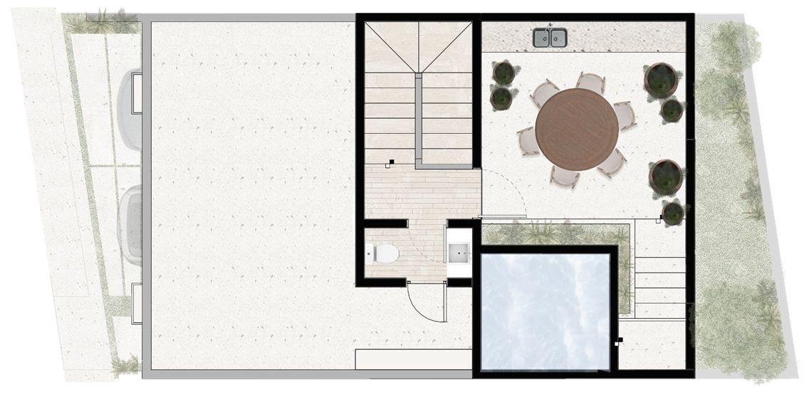 Half bathroom | Terrace with bar | Pool | Area for water tanks and equipment.