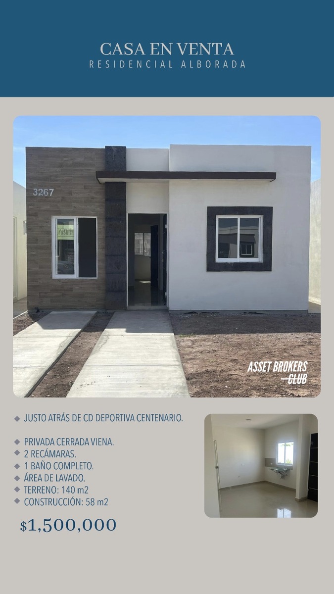 CASAS EN VENTA, RESIDENCIAL ALBORADA !! JUSTO ATRÁS DE LA CD DEPORTIVA CENTENARIO. EN PRIVADA CERRADA VIENA. 2 RECÁMARAS. 1 BAÑO COMPLETO. ÁREA DE LAVADO. TERRENO: 140 m2 CONSTRUCCIÓN: 58 m2 PRECIO: 1,500,000