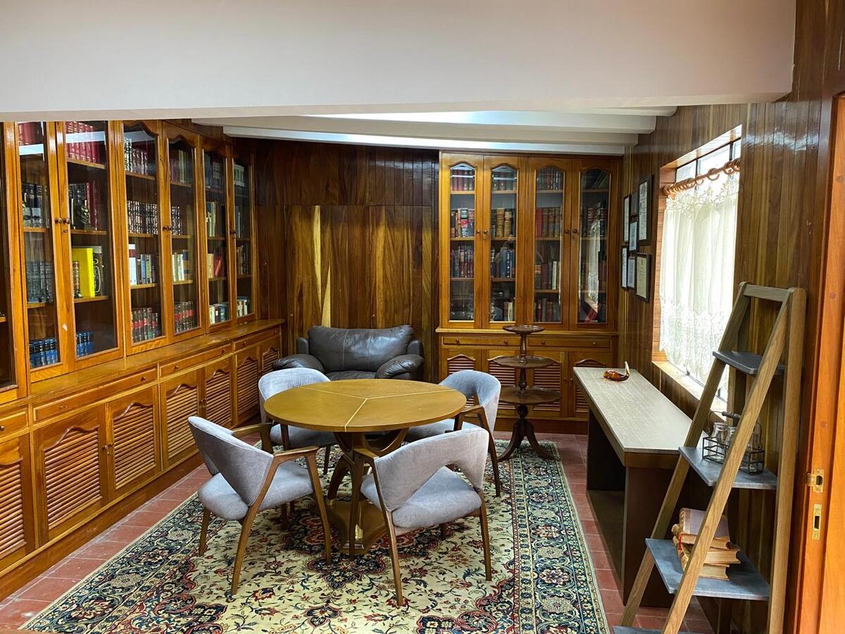 Atrás de la casa se encuentra en planta baja la biblioteca con libreros de Caoba y puertas con vidrio y en la planta alta el family room con medio baño y terraza.