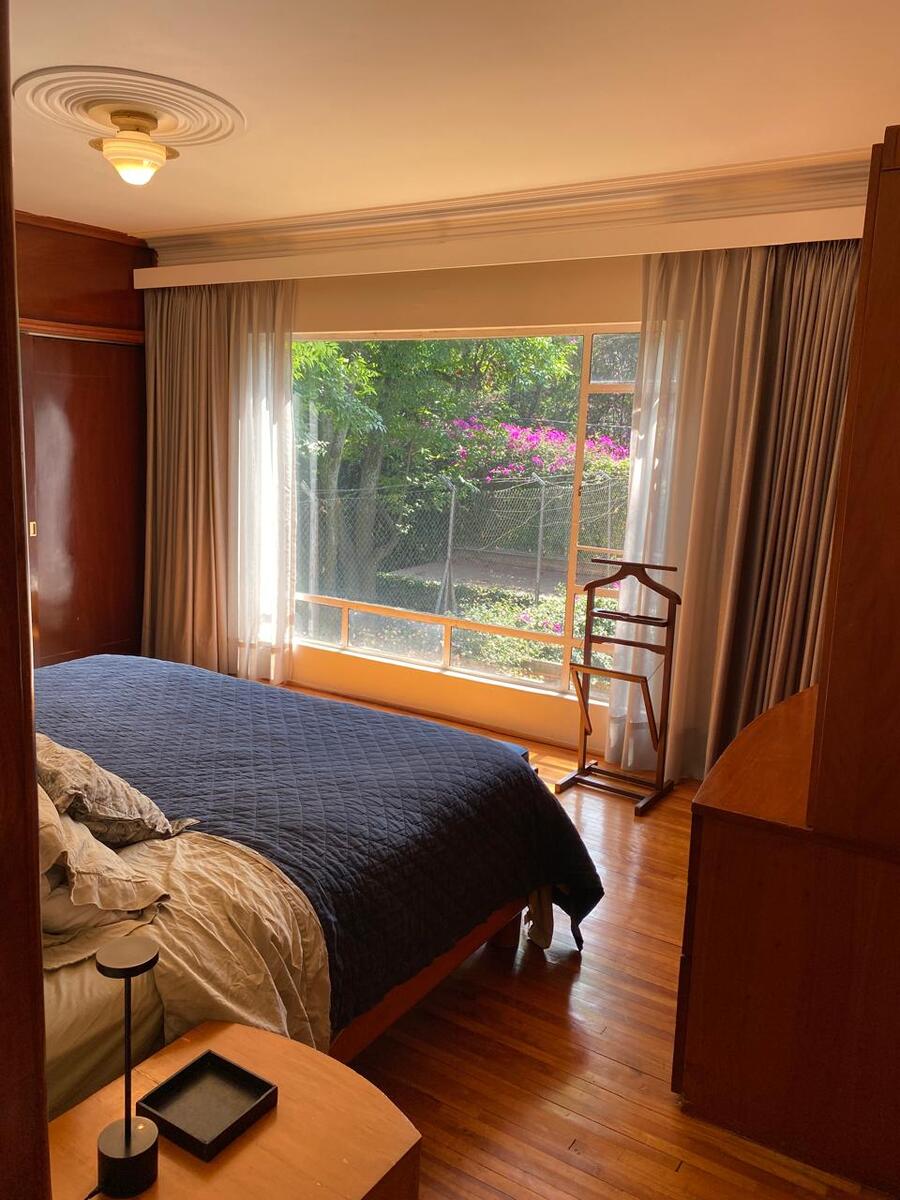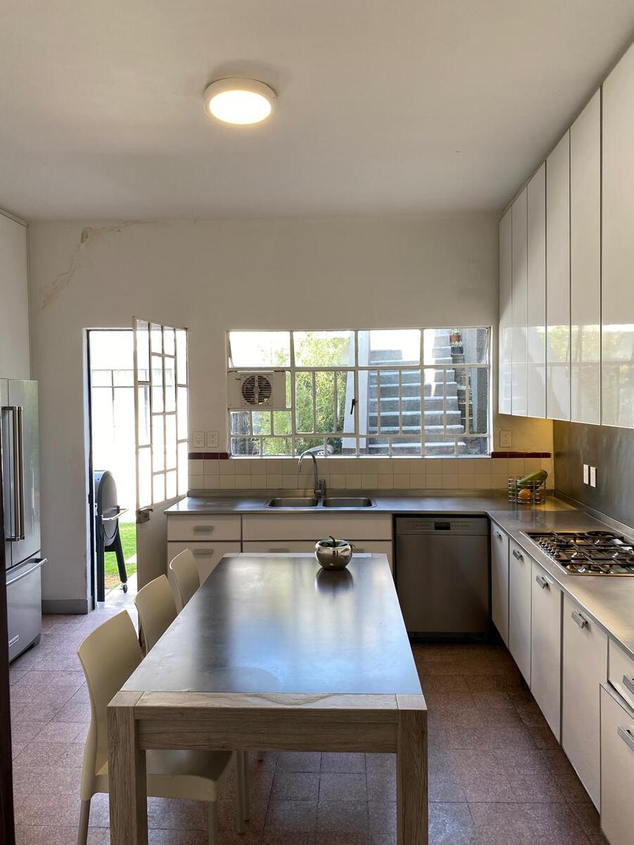 Es de dos niveles; en la planta baja está la sala con chimenea, ventanas de piso a techo, comedor con vista al jardín de 98m2, cocina, ante-comedor y patio.
