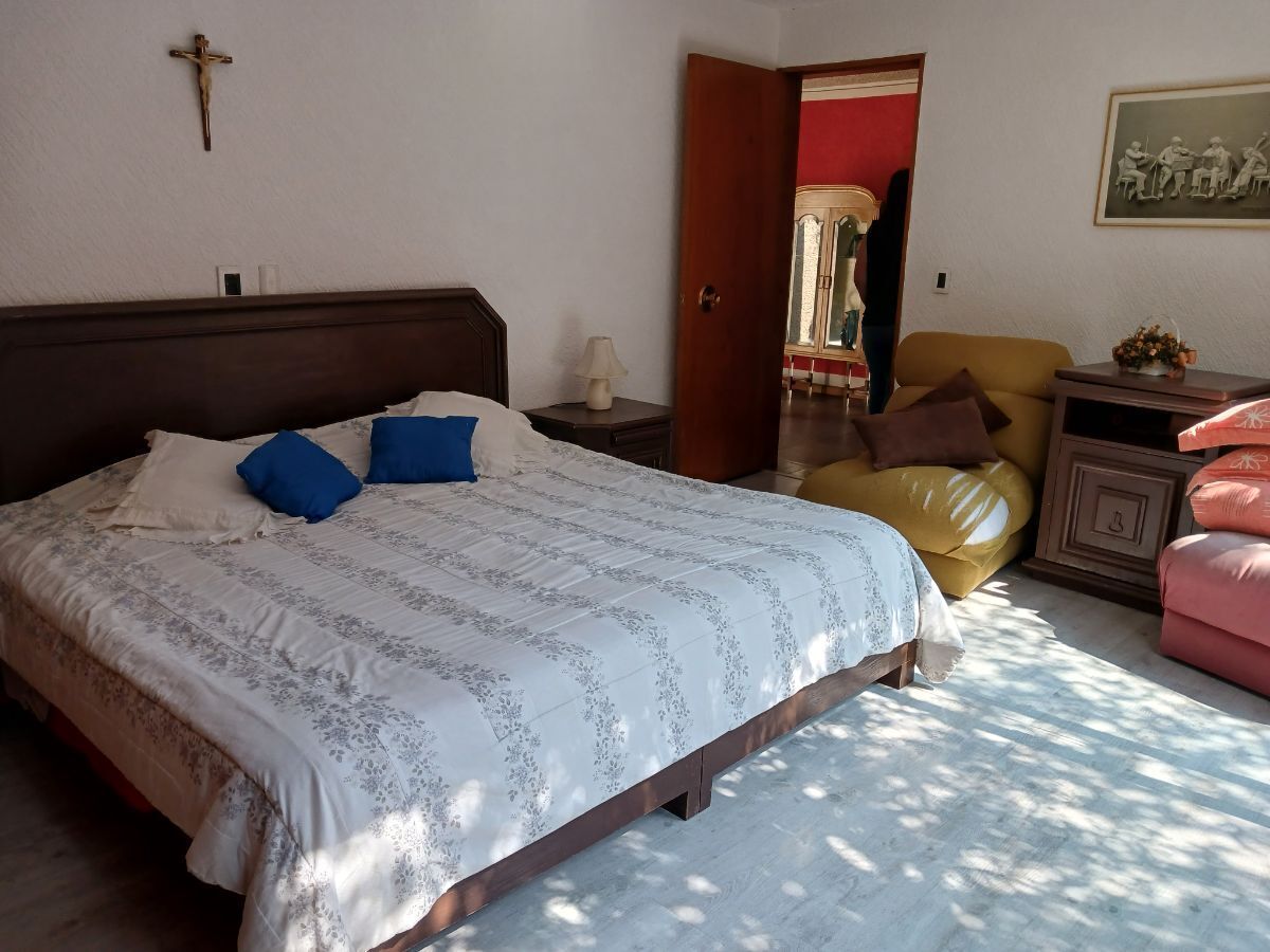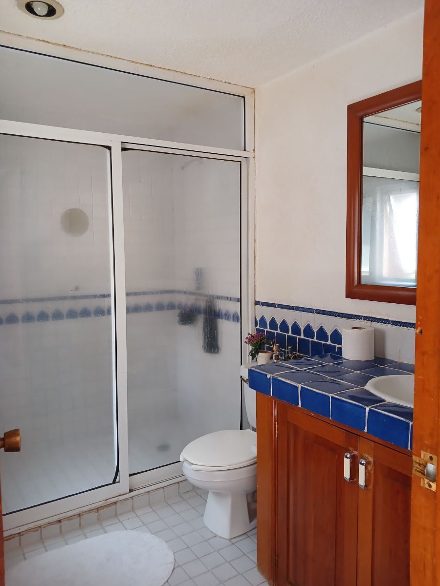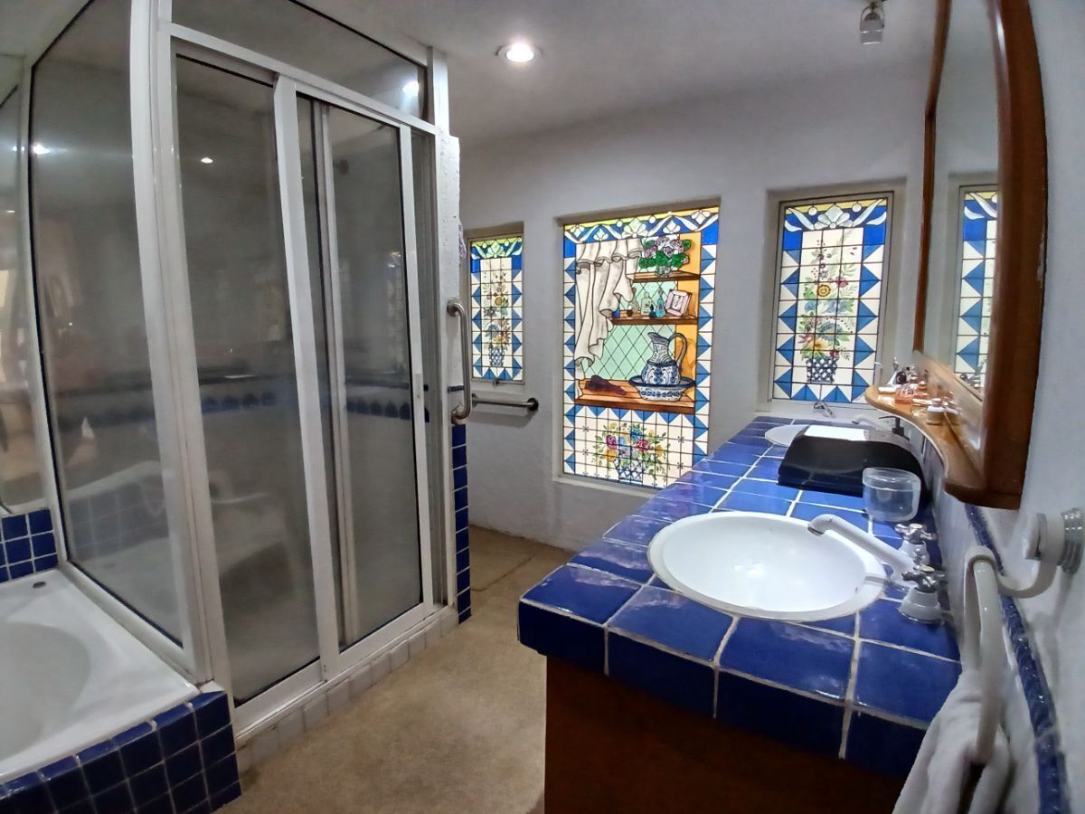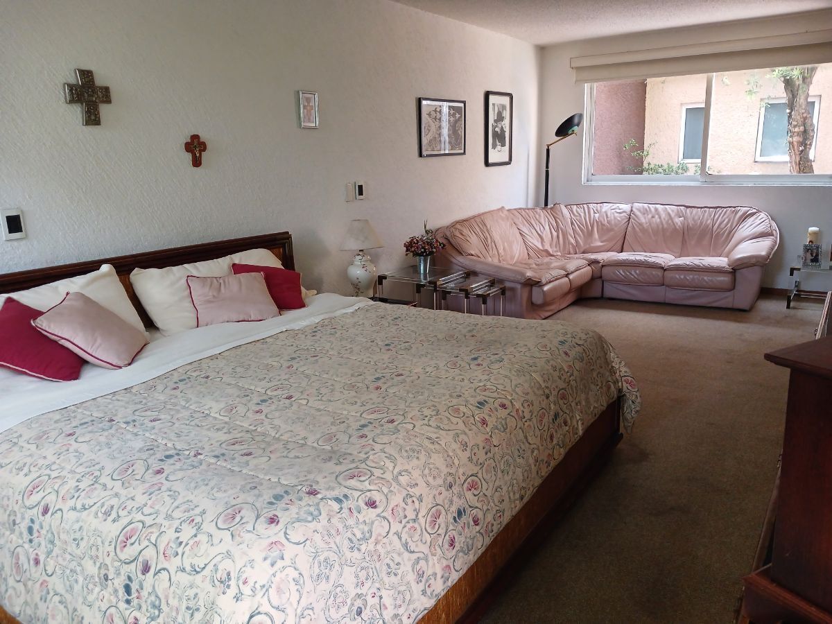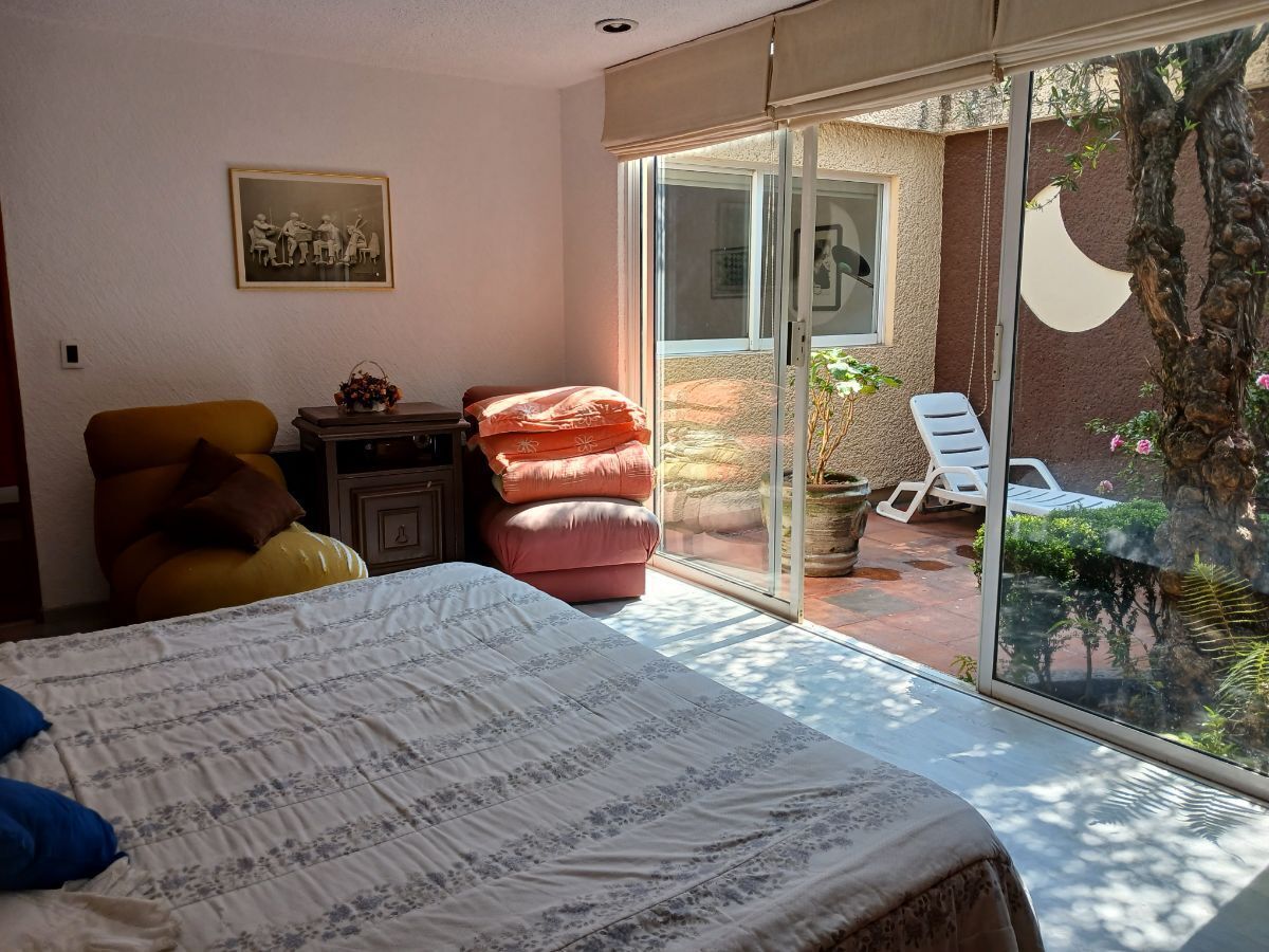 La recámara principal tiene vestidor y baño completo con jacuzzi, amplios closets, y unaamplia y acogedora sala, con vista al jardín y acceso al mismo.