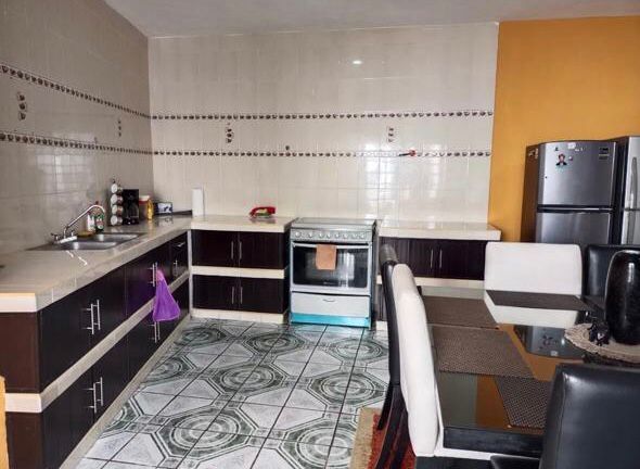Amplia sala-comedor con muebles modernos , cocina integral equipada y un espectacular patio con piscina y terraza.