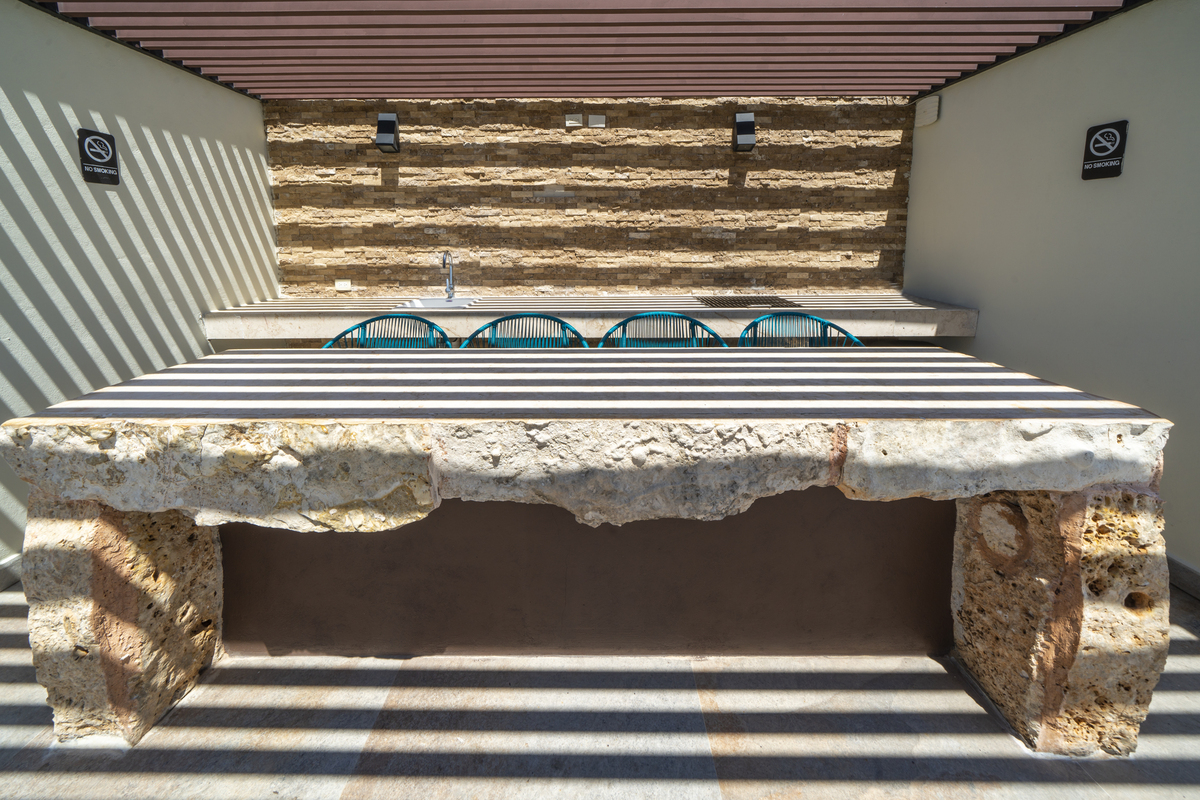 - Rooftop garden with pool, tables, and chairs