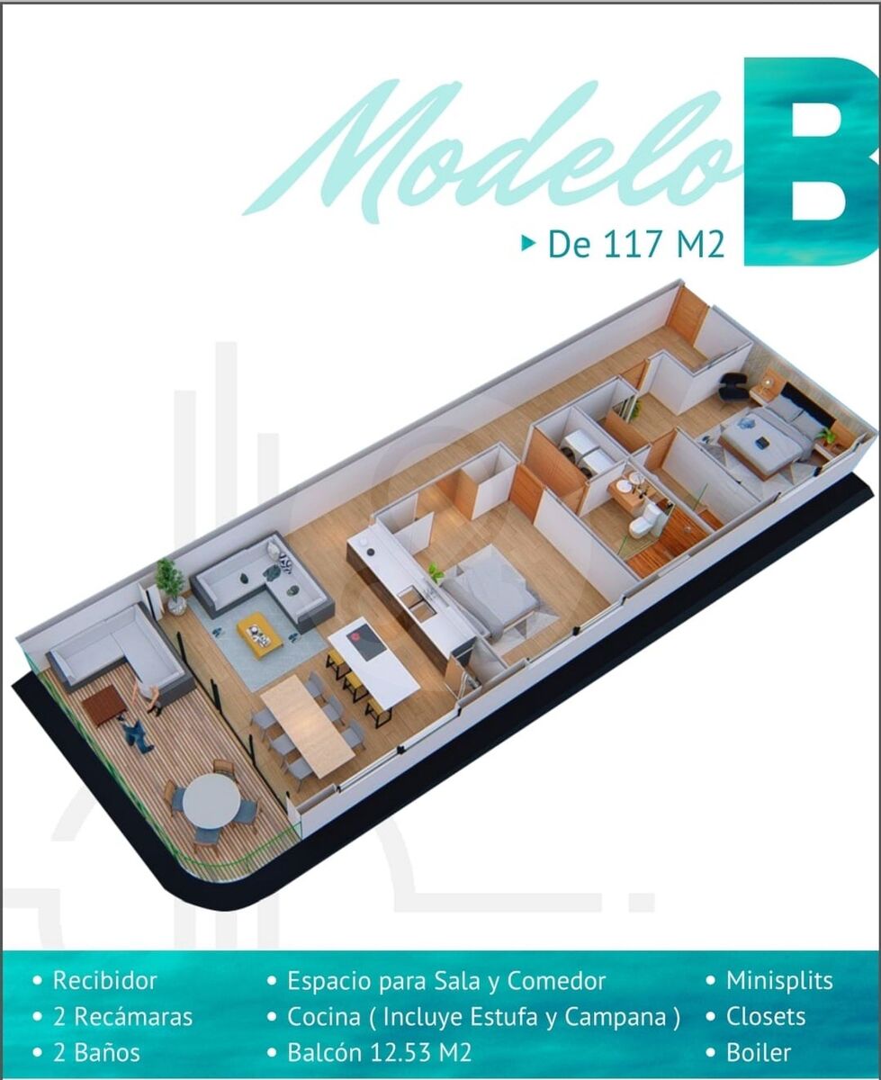Each of the condominiums in Pacific Pearl has an area of 117 m², space where the entrance, living-dining area, kitchen equipped with stove and hood, 2 bedrooms, 2 bathrooms, and a balcony with sea view are distributed. It is worth mentioning that all units have mini-splits, closets, and a boiler.