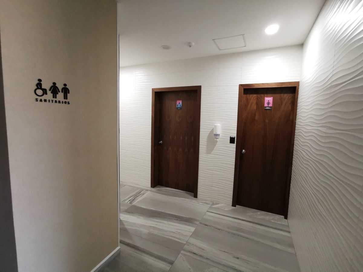 Áreas comunes por piso: Lobby (recepción), baños hombre/mujer y área de espera.