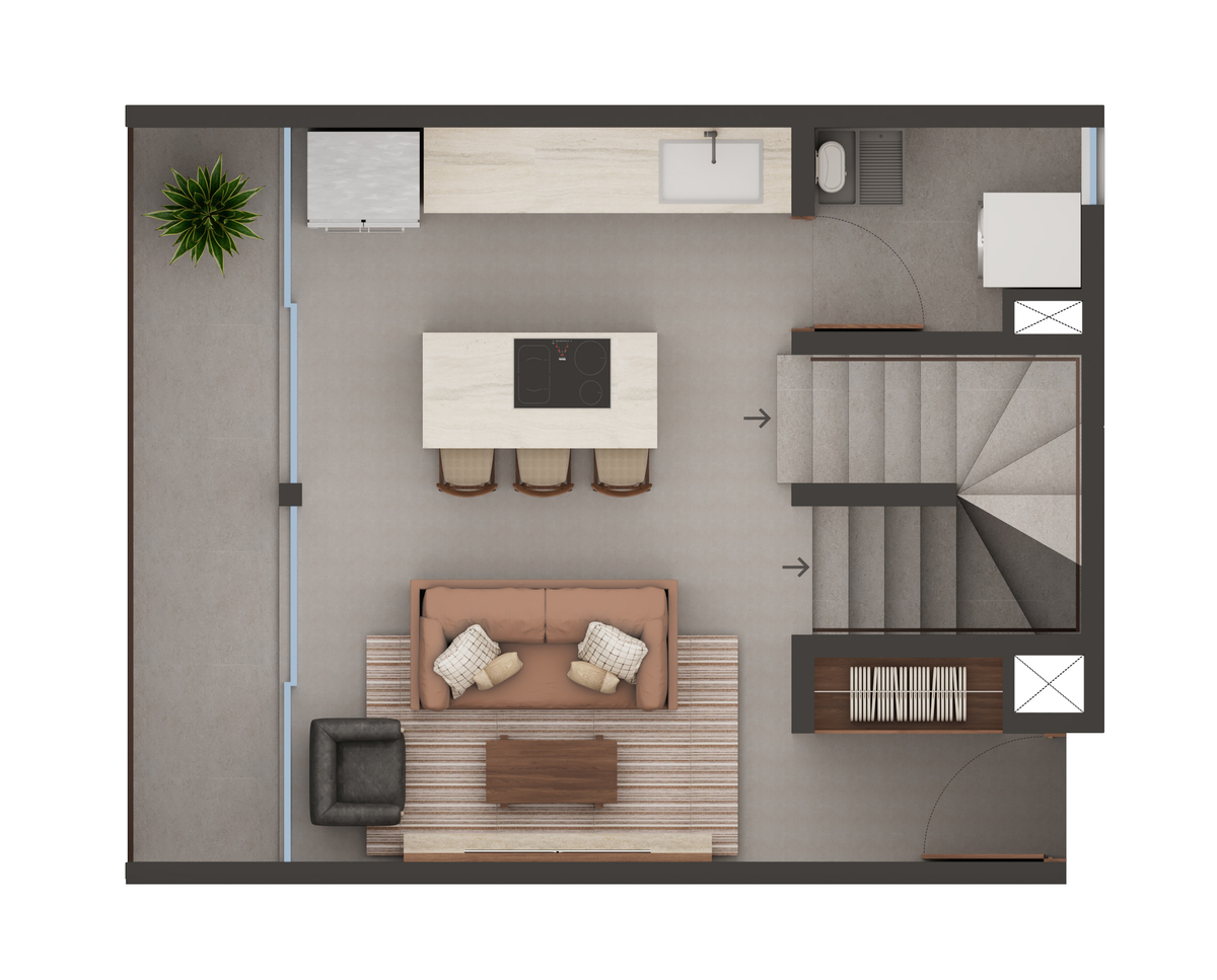 ● Distribución en dos niveles con áreas abiertas de sala y comedor