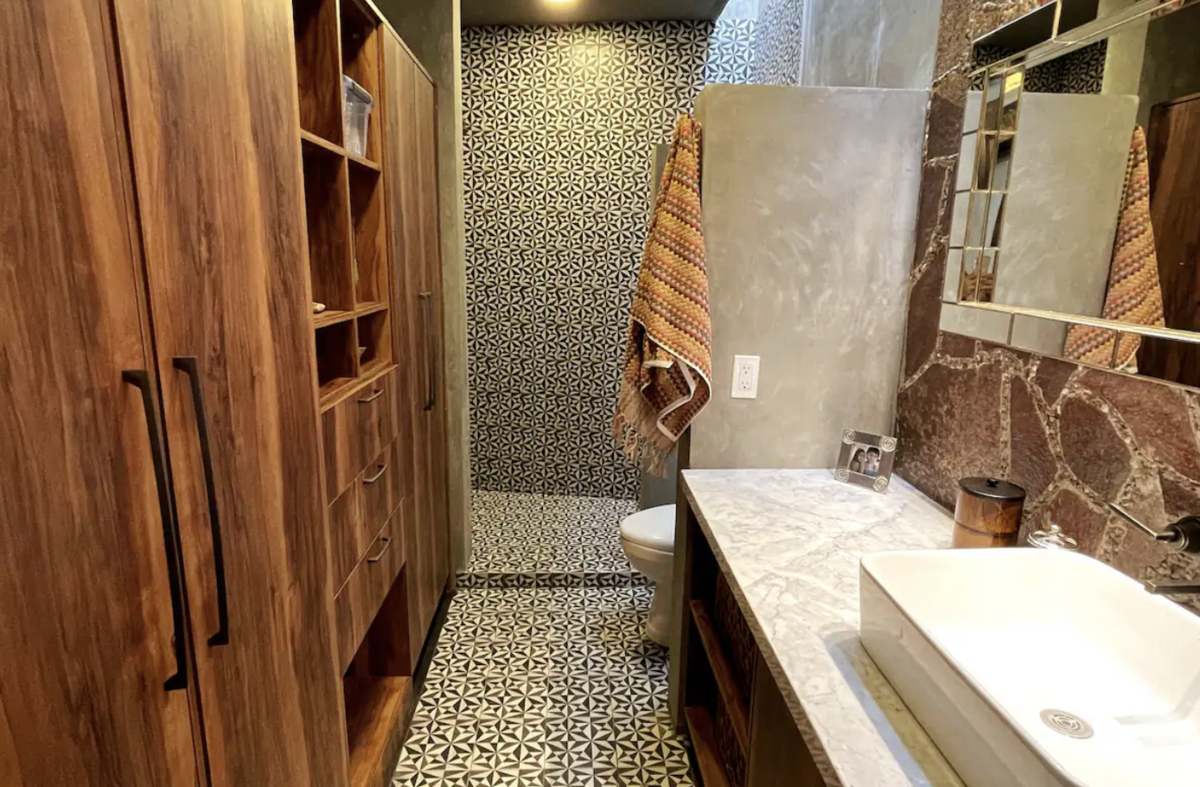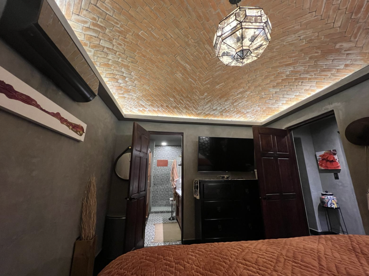 Retírese al dormitorio trasero adornado con un techo de bóveda tradicional y una lujosa cama tamaño king para pasar noches serenas. El baño privado es un santuario y cuenta con una cabina de ducha, un amplio espacio de guardarropas y un tragaluz para iluminación natural. Seleccionado profesionalmente por un diseñador de interiores estadounidense, este condominio rústico-moderno viene completamente amueblado y promete una elegancia incomparable.