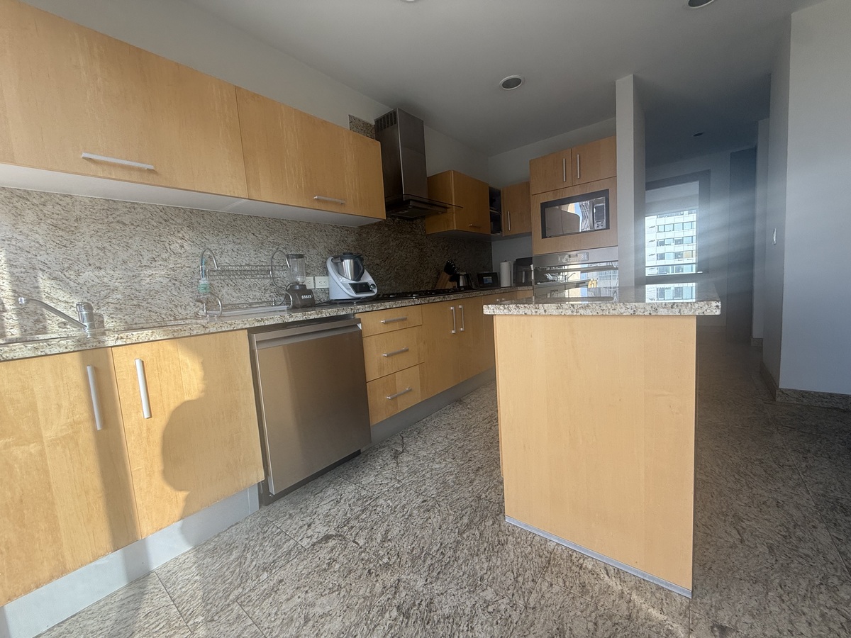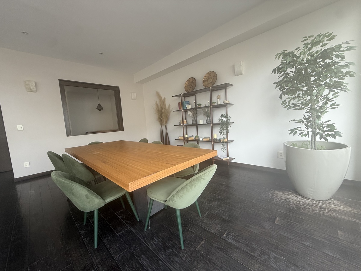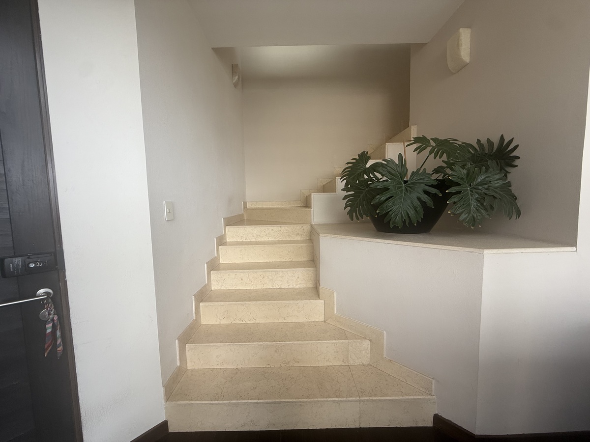 Distribuido en 2 niveles, con sala de doble altura con y comedor con salida la terraza, ante comedor, baño de visitas, cocina con barra de granito equipado con lavavajillas, refrigerador, área de lavado con lavadora y secadora y cuarto de servicio con baño y bodega. Ven a dormir ven