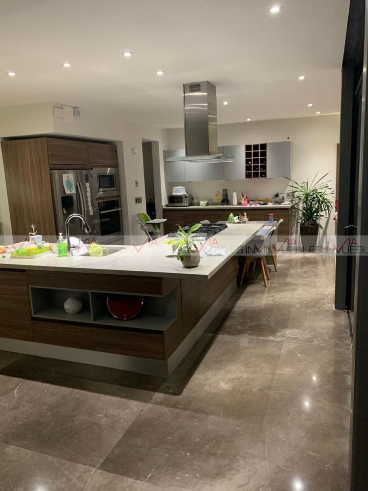 Planta Baja: cochera con portón eléctrico para dos autos, que comunica con el patio, sala con chimenea eléctrica, comedor con área para guardar cristalería, baño de visitas, cocina con cubierta de granito, equipada con estufa, horno, refrigerador y lavavajillas, sala al lado de cocina y oficina con escritorio empotrado con baño completo que pudiera convertirse en recamara.