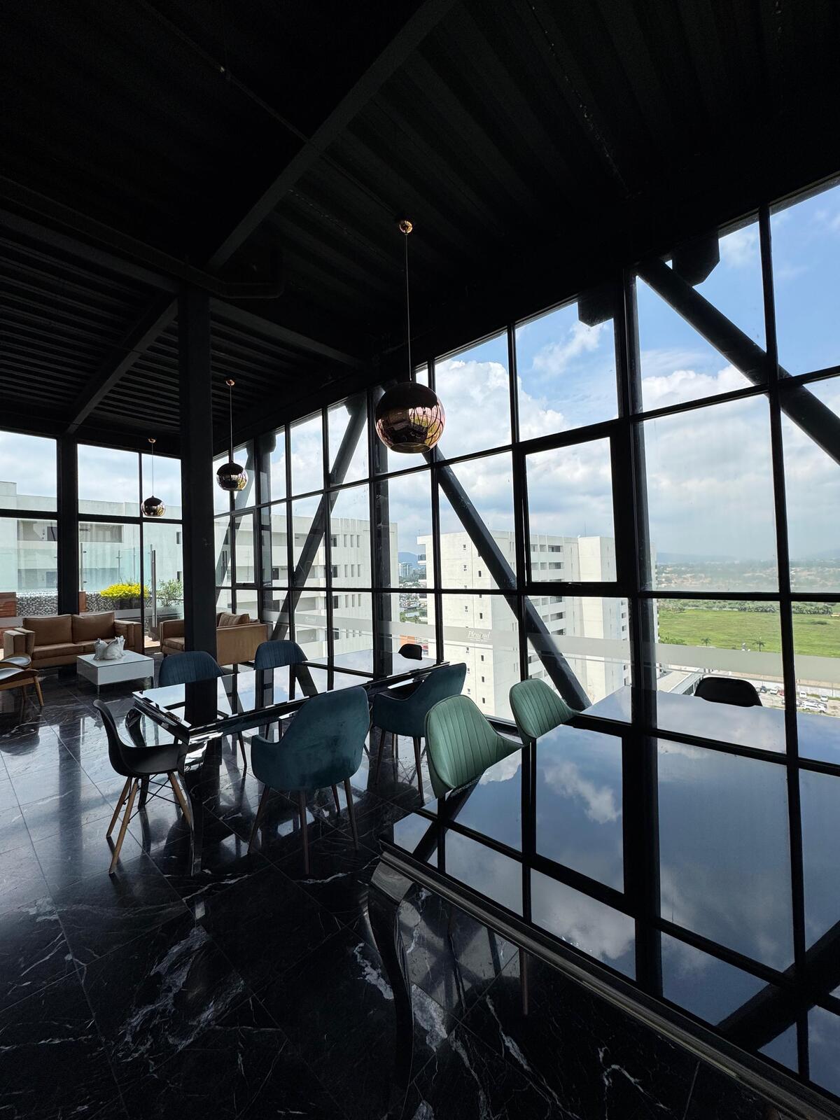 Rooftop con amenidades de lujo: alberca, sky bar, gimnasio, sala de juntas y lobby.