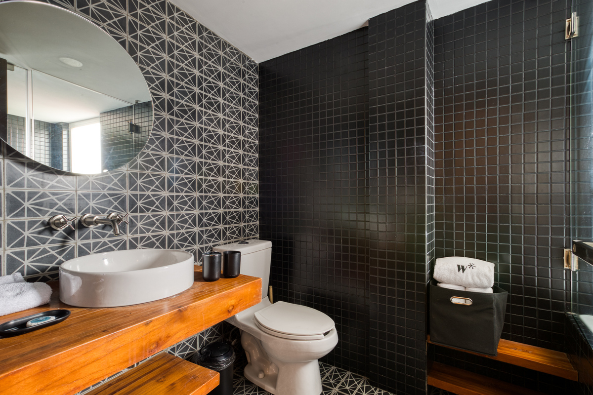 El primer penthouse se divide en dos niveles. En la planta baja, encontrará una recámara y un baño completo, una amplia sala-comedor, una cocina totalmente equipada y un cuarto de lavado. En la planta alta, encontrará una recámara secundaria con clóset y baño completo, además de la recámara principal, que cuenta con sala de televisión, baño en suite con jacuzzi y vestidor.