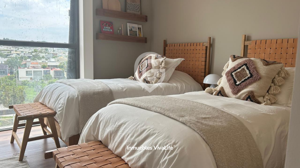 Cuenta con cocina equipada, área social con vista panorámica, acabados premium y distribución funcional. La recámara principal incluye vestidor y baño completo, y las secundarias cuentan con clóset y baño propio.