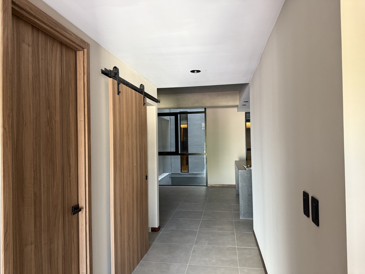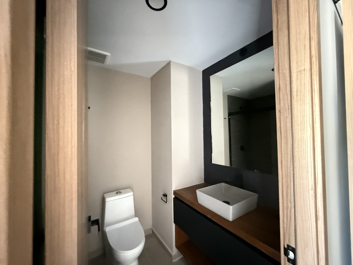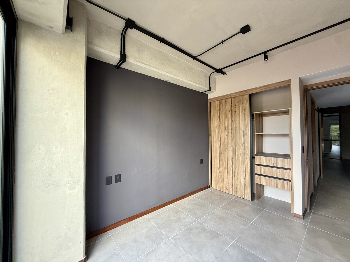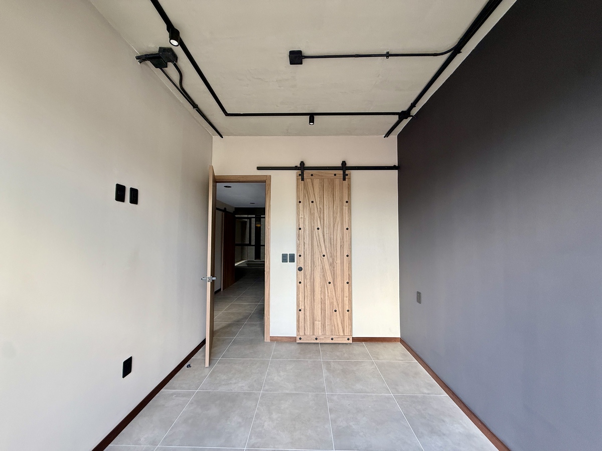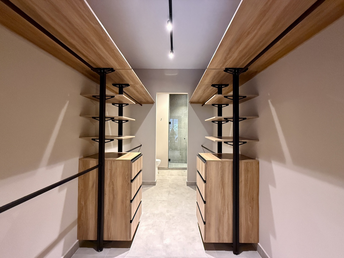 Las dos recámaras están separadas del área social, brindando mayor privacidad. La recámara principal cuenta con baño completo propio y walking-closet, mientras que la secundaria tiene acceso a un segundo baño completo que también da servicio a las visitas. Además, el departamento tiene área de lavado, dos cajones de estacionamiento en formato de eleva-autos y una bodega de 6.13 m².