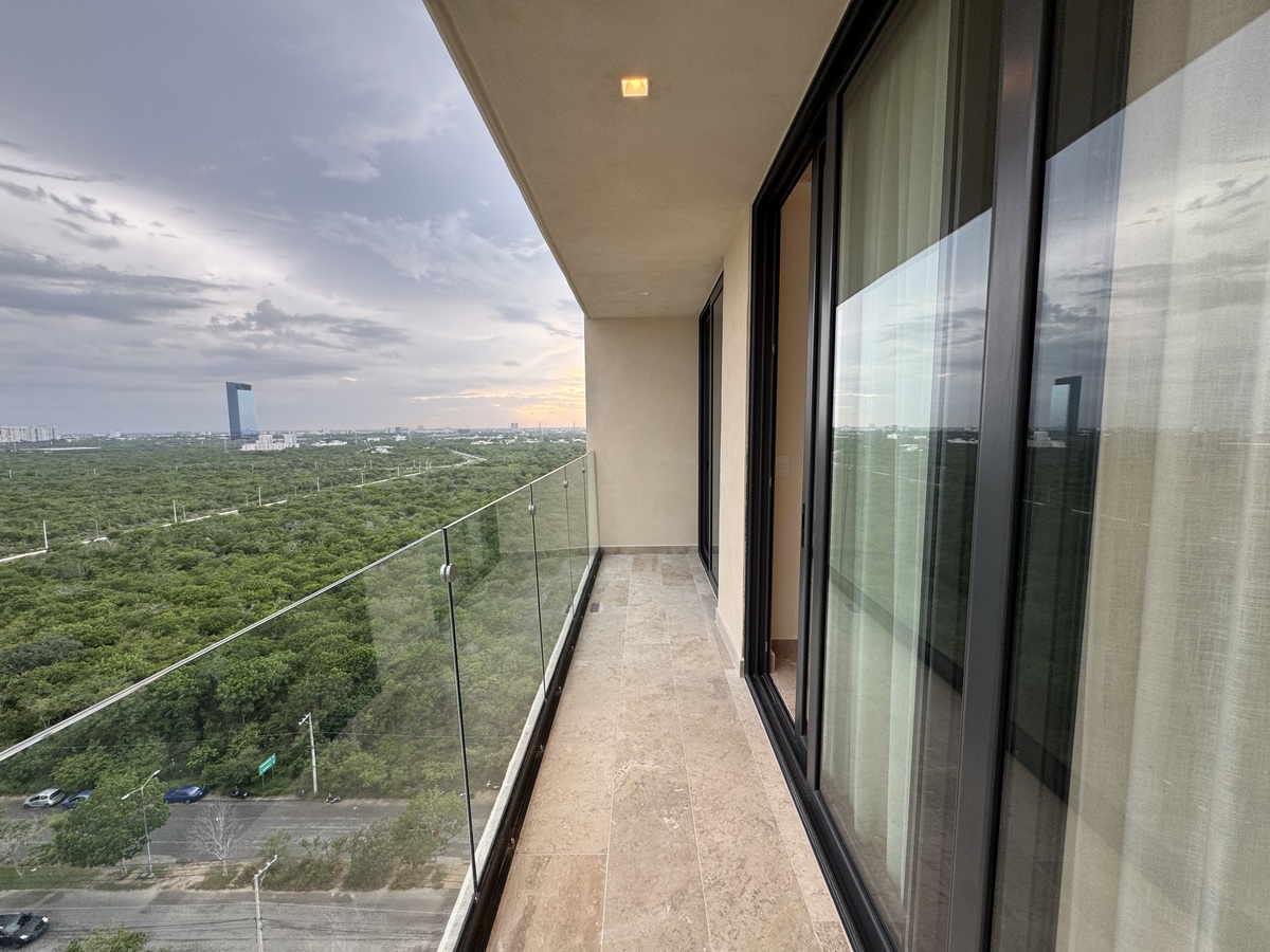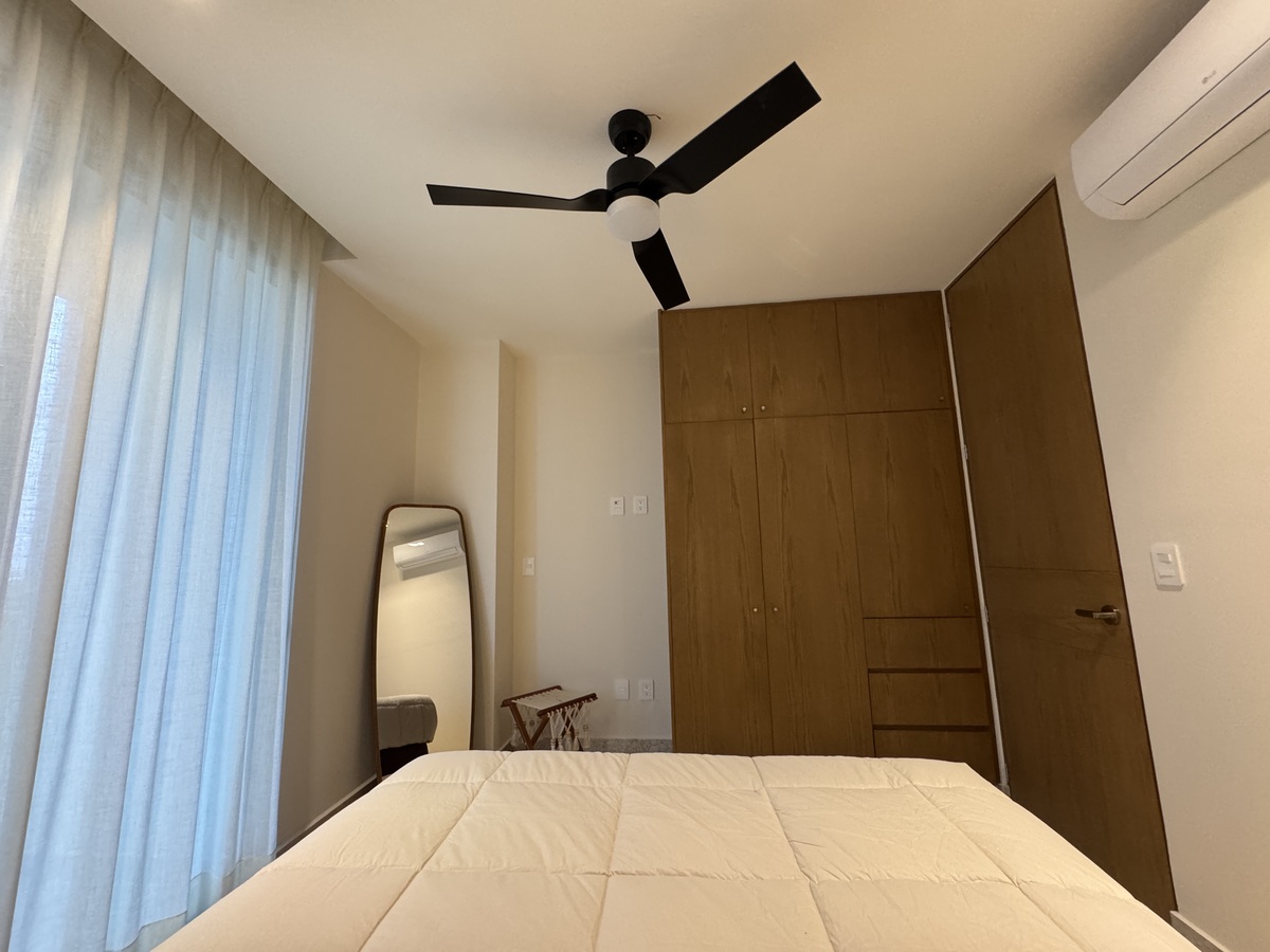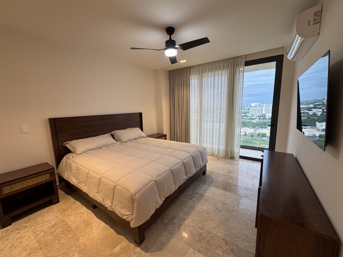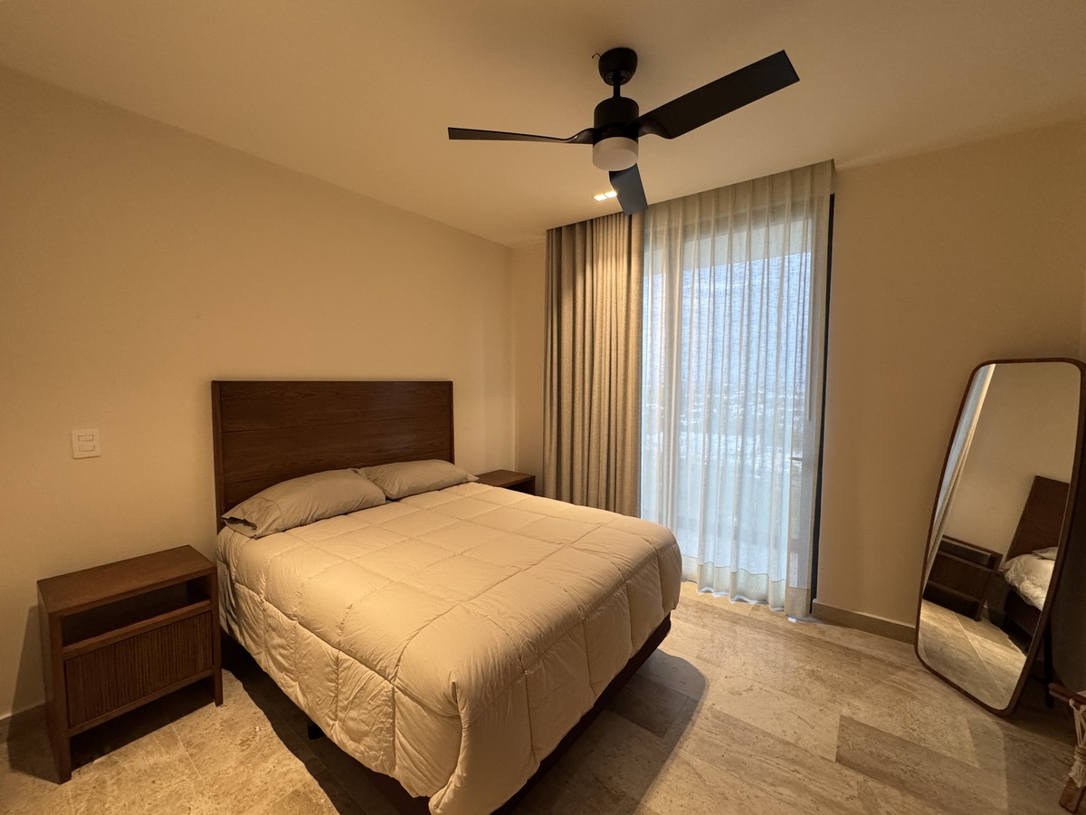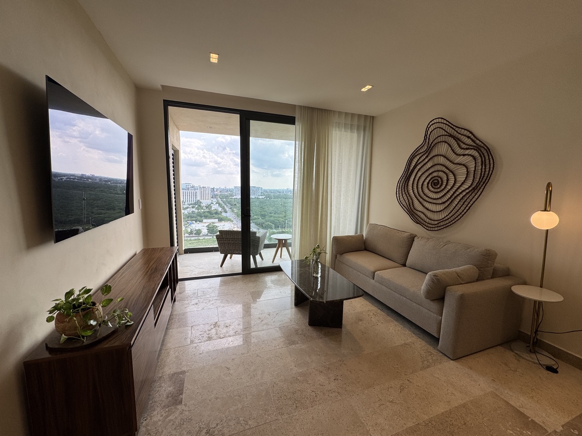 Totalmente amueblado y equipado a estrenar, con mobiliario y electrodomésticos nuevos, amplios espacios, acabados de primera y un balcón panorámico que conecta ambas recámaras.